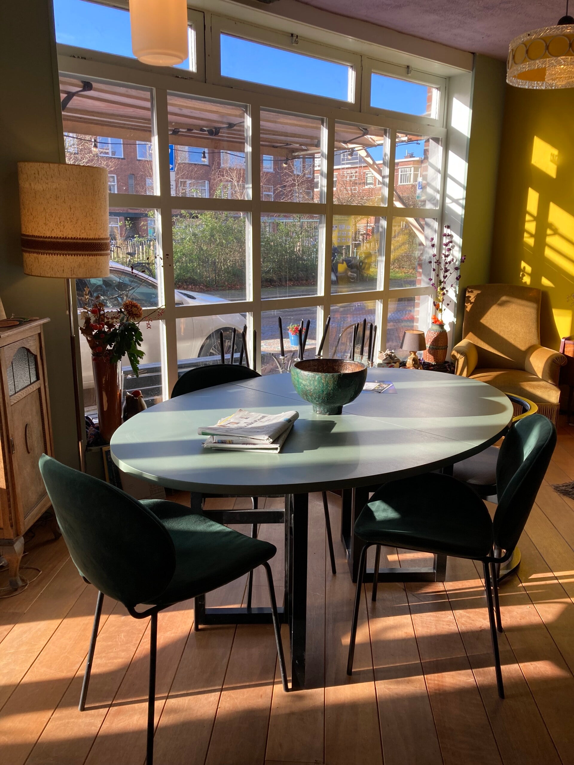 Geen vintage, maar wel stijlvol en heel comfortabel. Moderne eettafelstoelen met heel zachte suedine bekleding in mooie donkergroene kleur en zwart metalen poten.