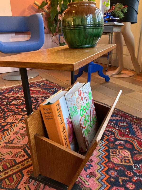 Vintage mid-century lectuurbak / bijzettafel. Een mooi teakhouten meubel en multi-functioneel, want: opruimen én iets moois erop zetten! :)