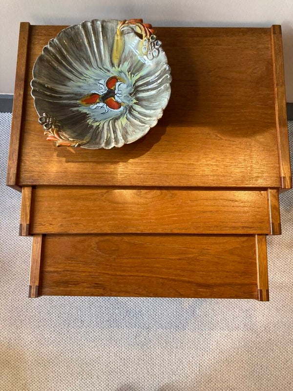 Deze mid-century set is uitgevoerd in prachtig teakhout met ambachtelijke houtverbinding en gedetailleerde boogvormige afwerking in de voet. Het zijn die speciale details die dit tot zo'n bijzondere en waardevolle vintage set maakt.