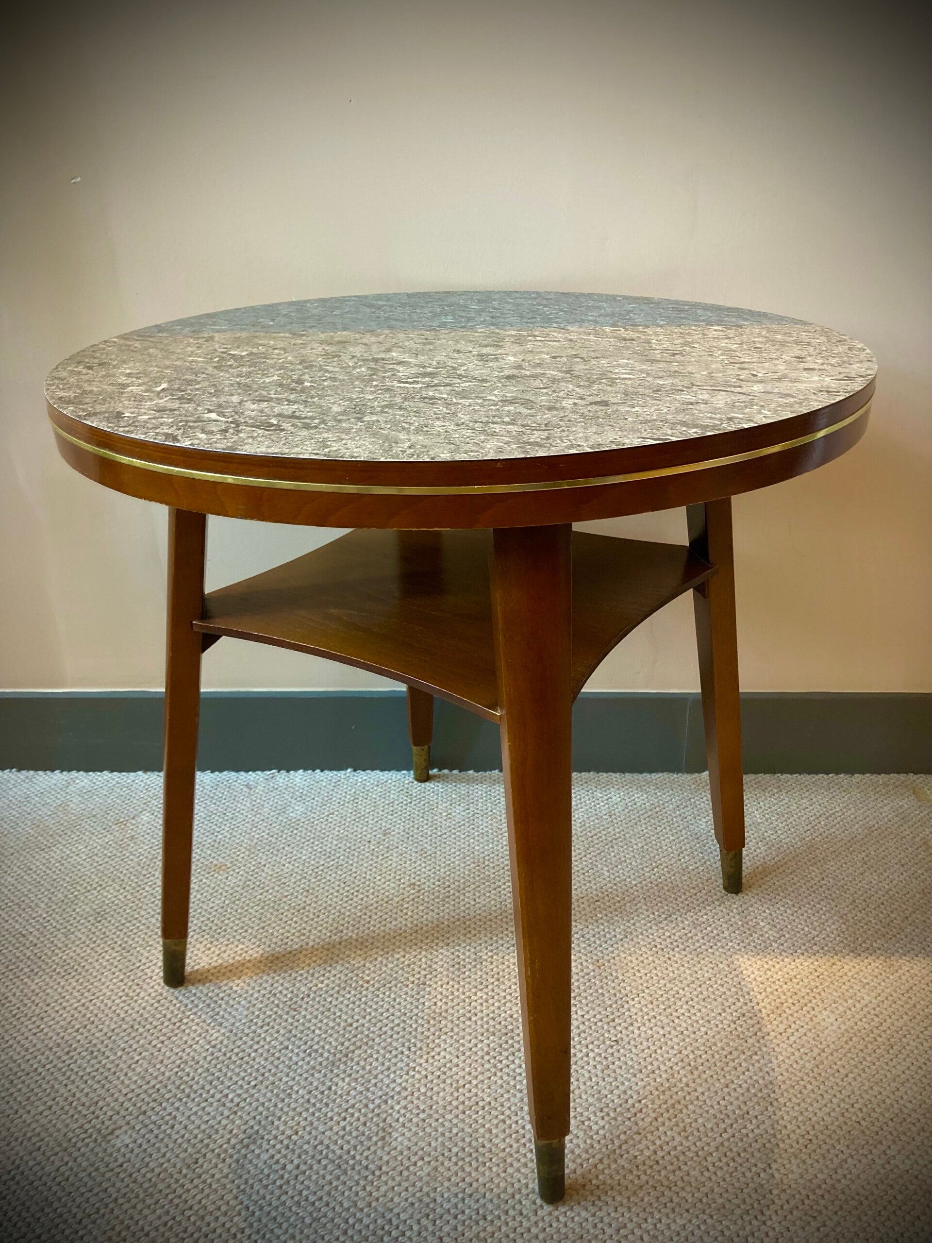 Teakhouten onderstel met messing voetjes en ook bij dit tafeltje is er ruimte voor tijdschriften. Het formica blad heeft een gemarmerd patroon en een messing detail verwerkt in de rand.