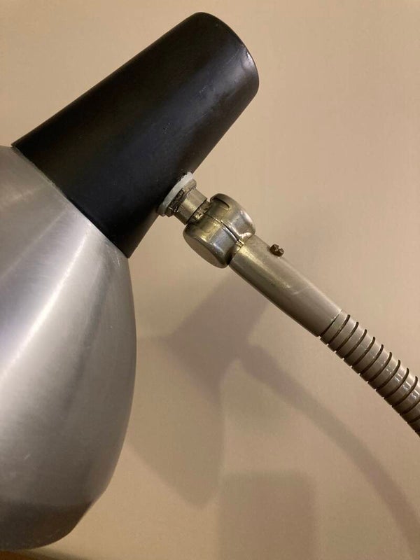 Vintage Hala bureaulamp. Strak ontwerp uit de jaren '60, aluminium kap met een buigbare arm, op een zwart metalen voet.