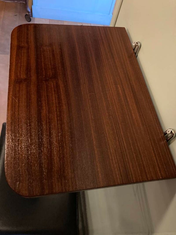 Charmant, strak vintage jaren ‘60 wand telefoontafeltje van teakhout met verchroomd rekje aan de onderzijde.