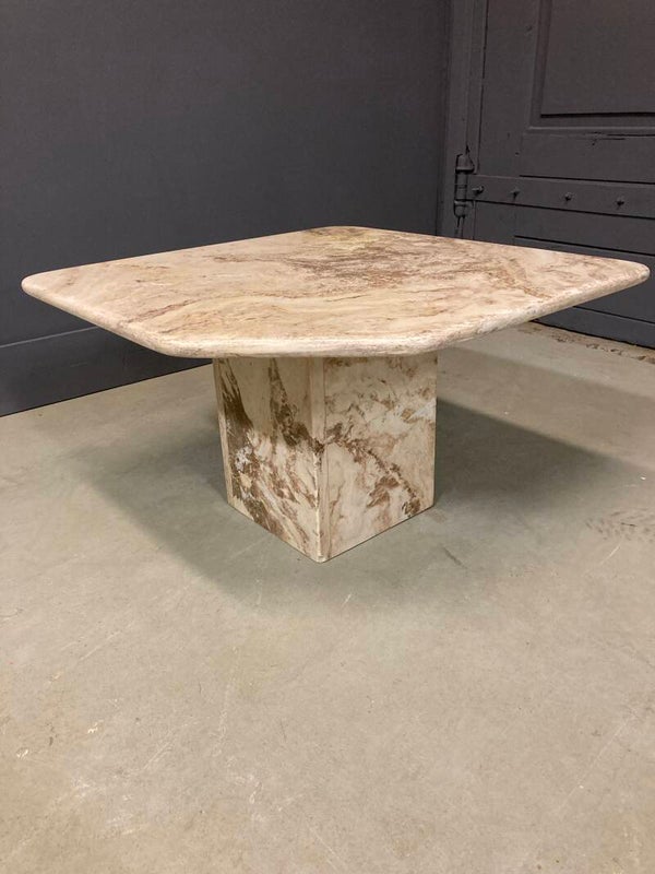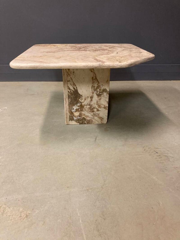 Stijlvolle vintage marmeren bijzettafel jaren ‘70. Vierkant blad met een asymmetrische zijde op een vierkante voet.