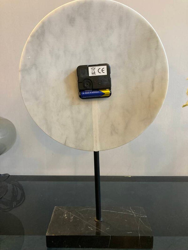 Chique klok, wit marmeren wijzerplaat op een zwart marmeren voet.