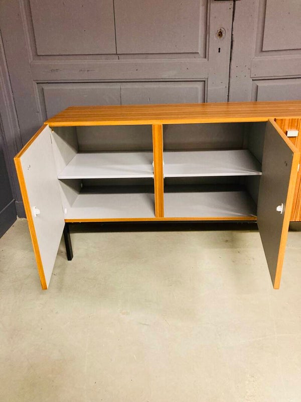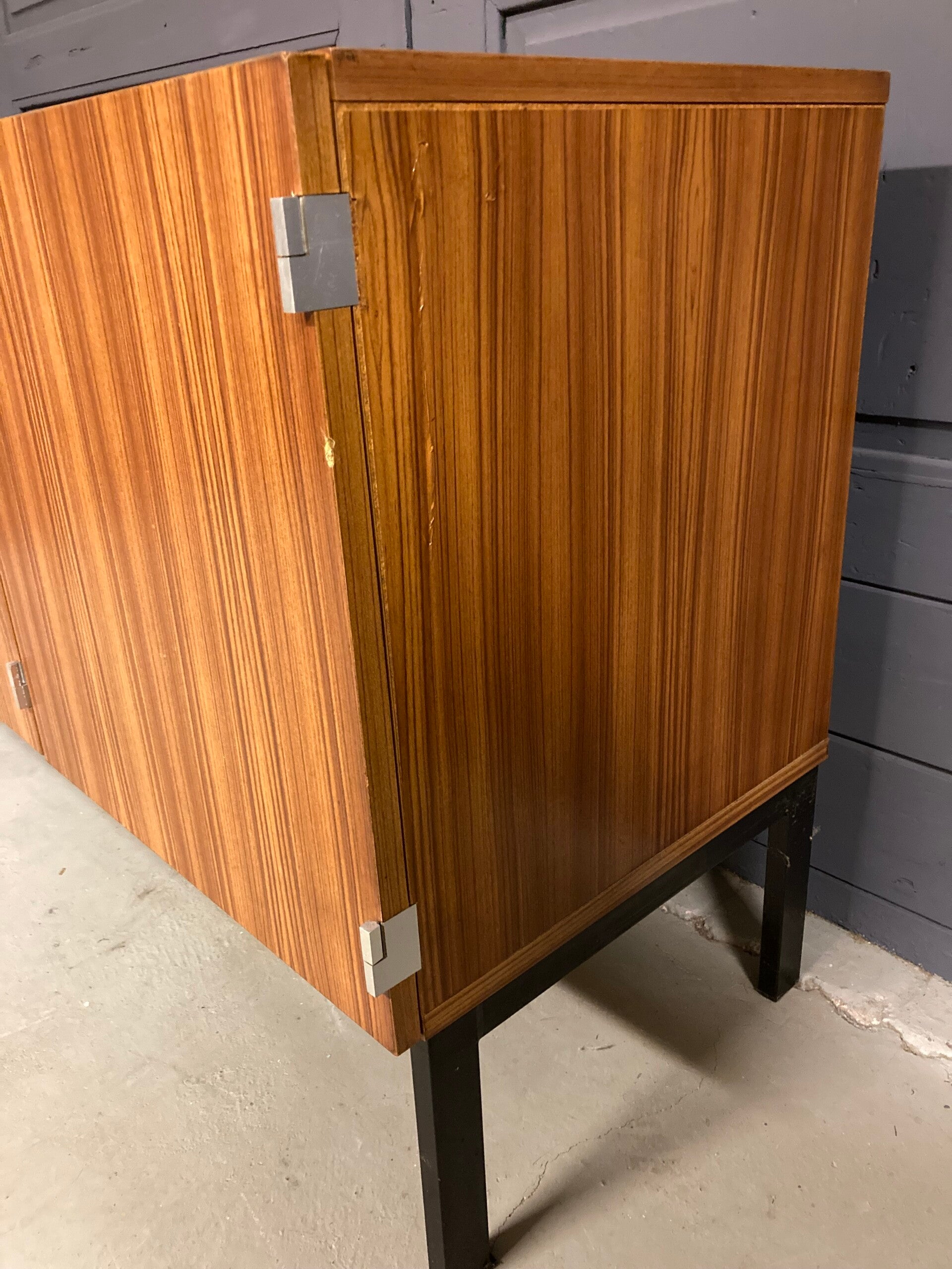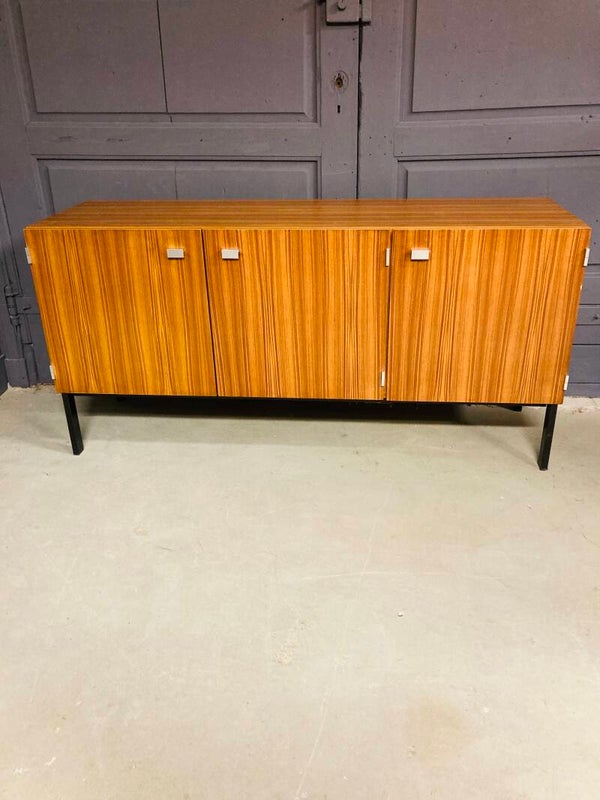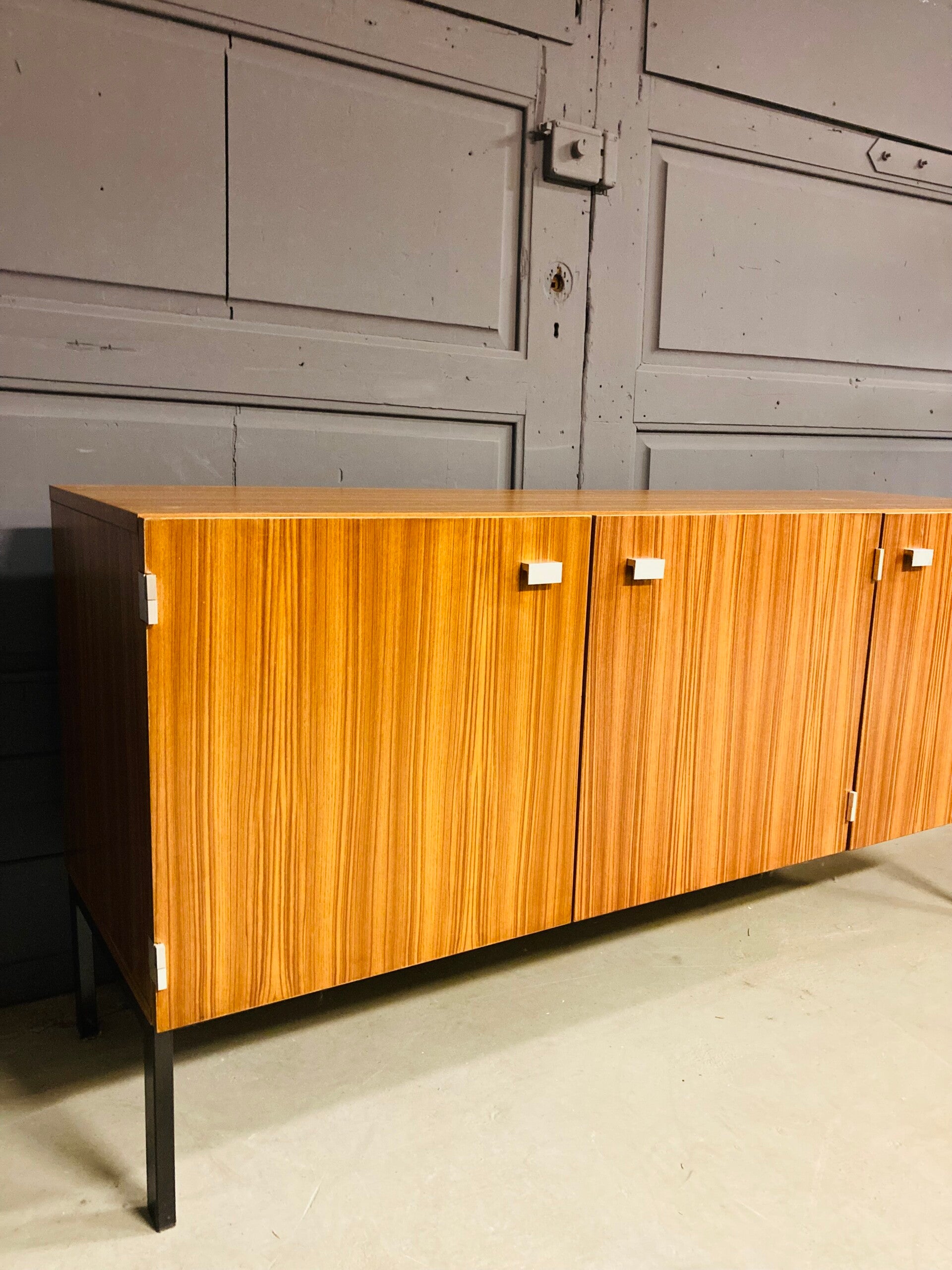 Zo ook voor dit dressoir. Een strak recht toe recht aan model van Pierre Guariche voor Meurop. Een houten frame afgewerkt met een kunststof folie met een houtprint, op een zwart gelakt metalen onderstel. De handgrepen zijn metaal.
