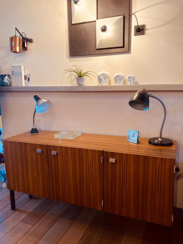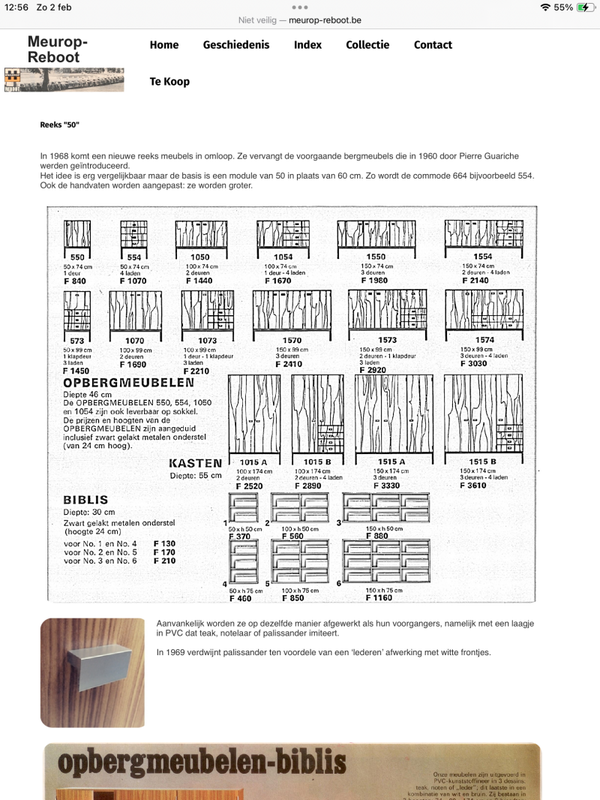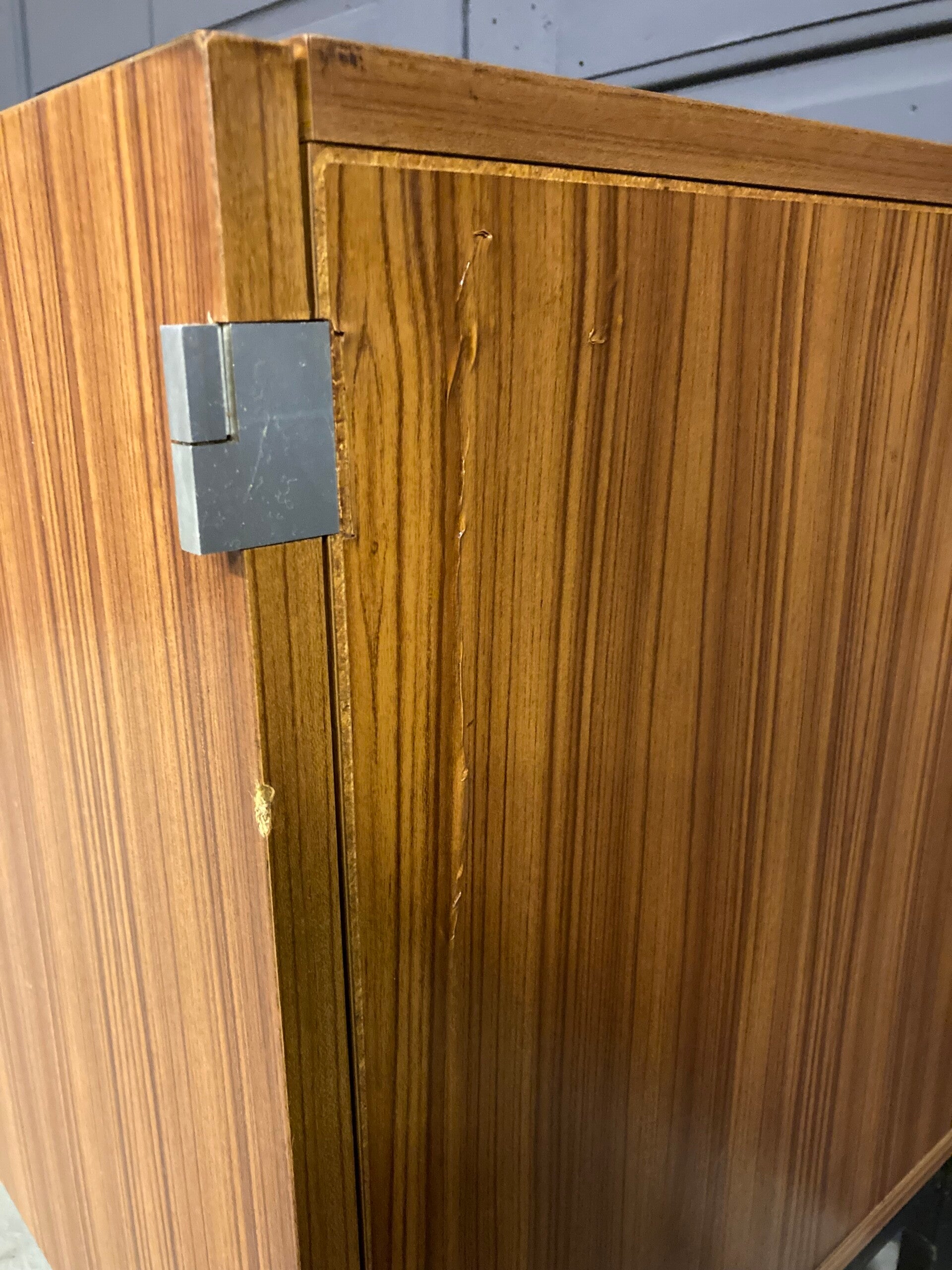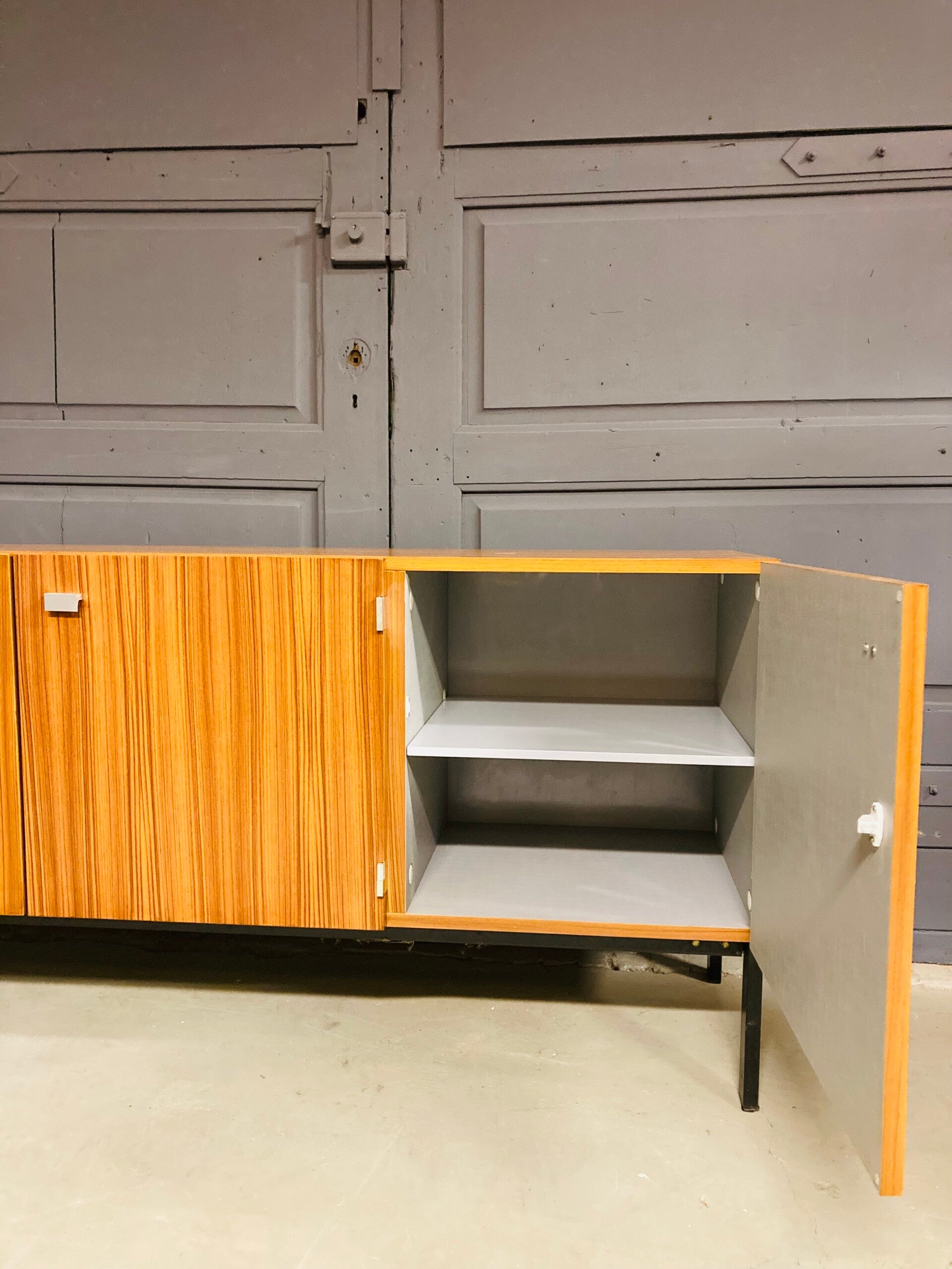 Zo ook voor dit dressoir. Een strak recht toe recht aan model van Pierre Guariche voor Meurop. Een houten frame afgewerkt met een kunststof folie met een houtprint, op een zwart gelakt metalen onderstel. De handgrepen zijn metaal.