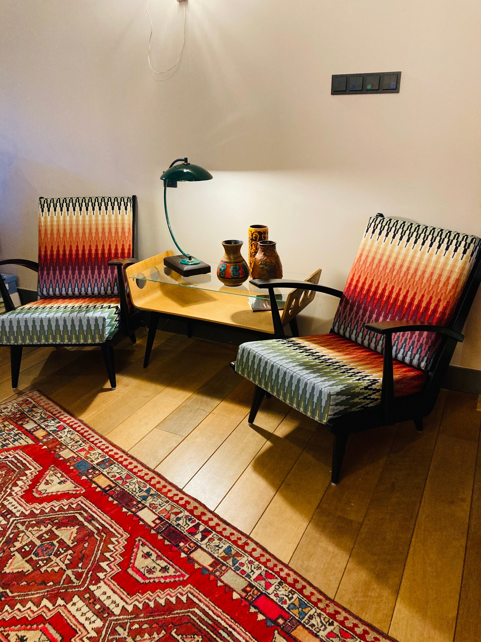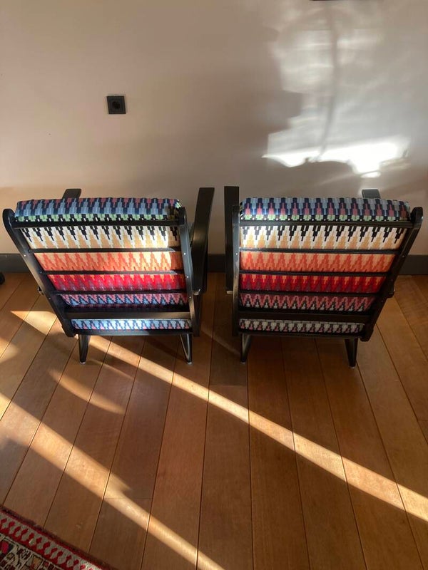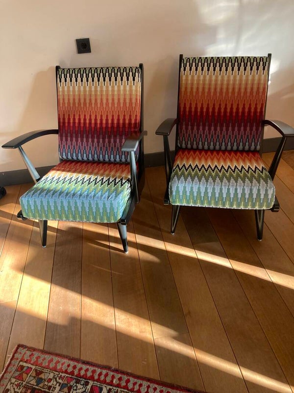 Een vrolijke noot in huis, deze mid-century fauteuils.