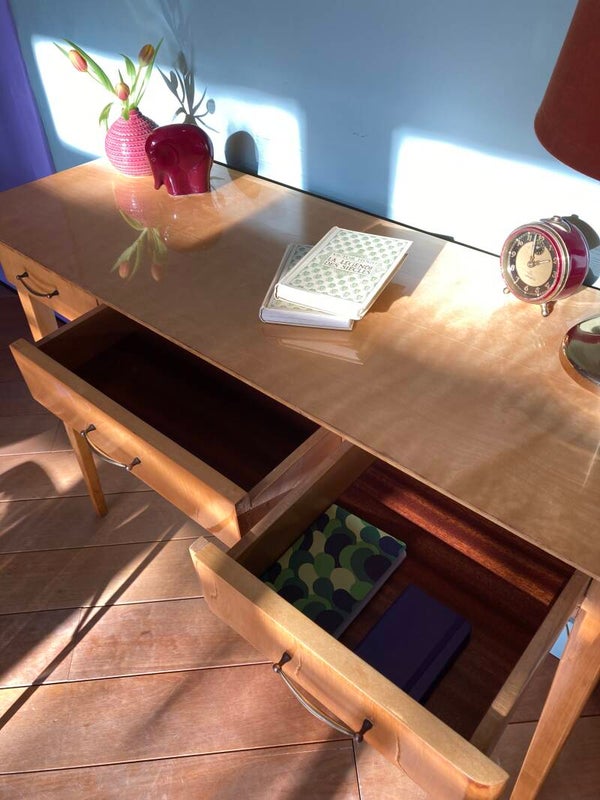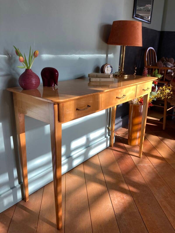 Jaren ‘60 haltafel met 3 lades van het Belgische meubelmerk Imexcotra. Glanzend gelakt esdoorn fineer. De lades zijn mooi afgewerkt met afgeronde hoeken en hebben messing ladegreepjes.