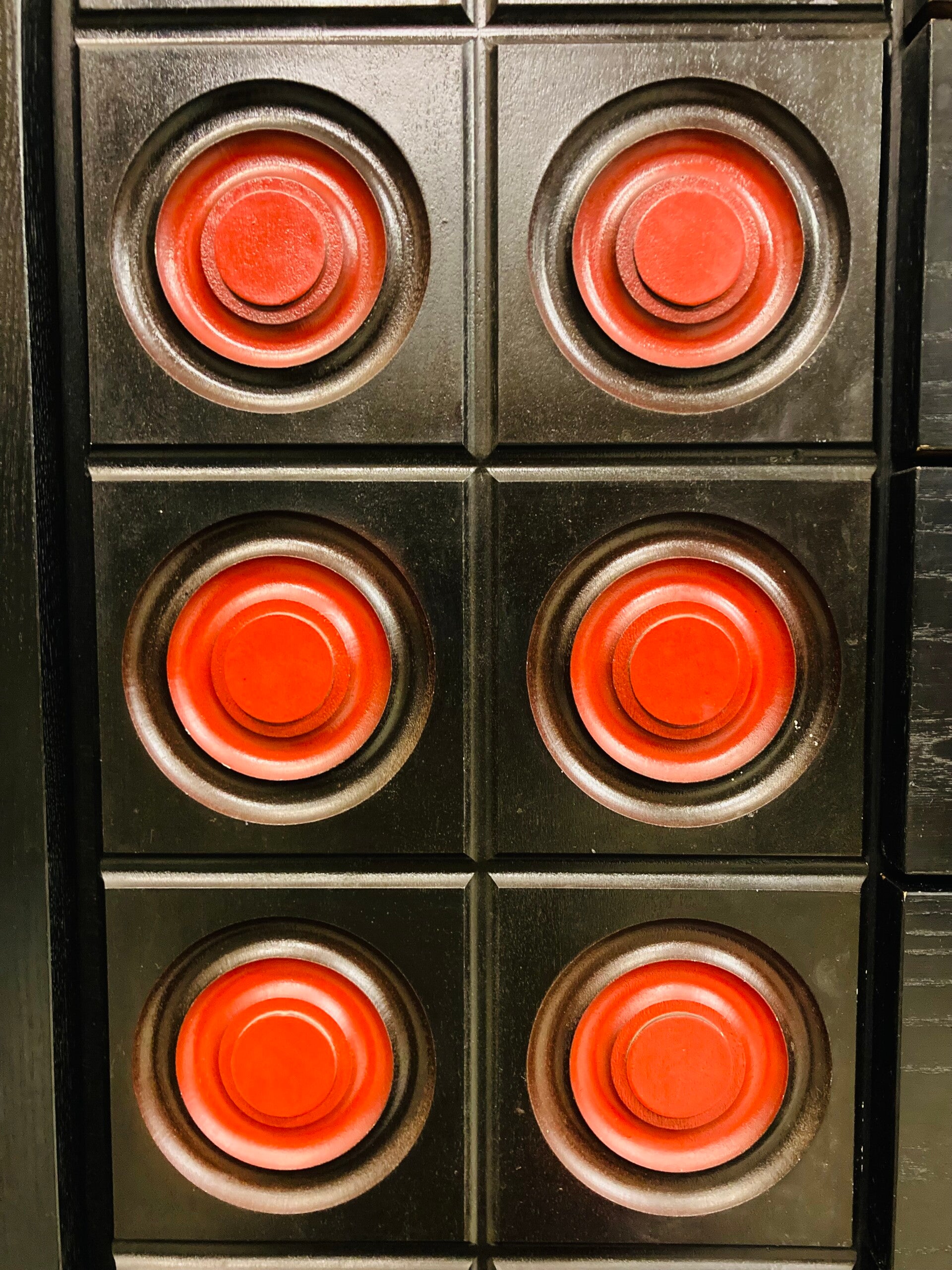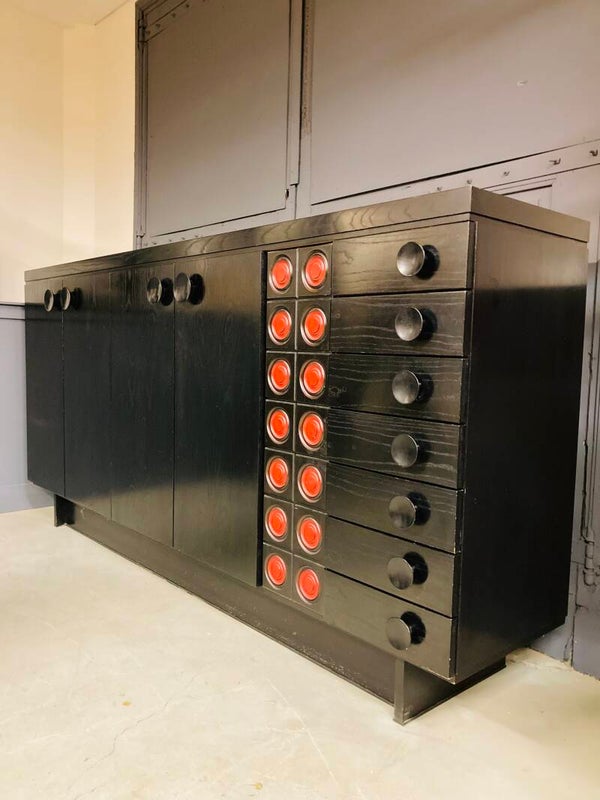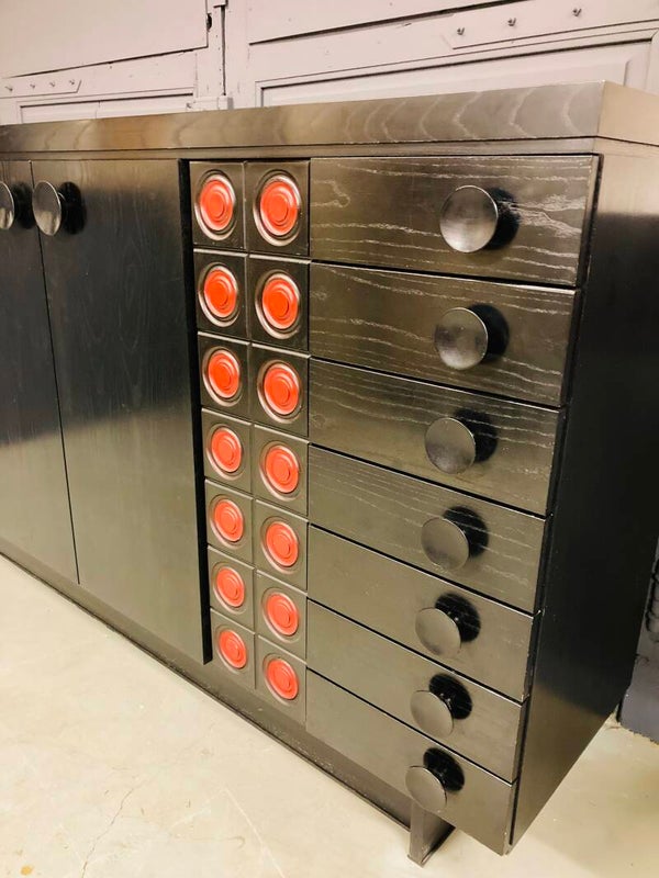 Uitgevoerd in zwart fineer met een rood grafisch paneel en zwart metalen handgrepen. Een geweldige blikvanger in het interieur!