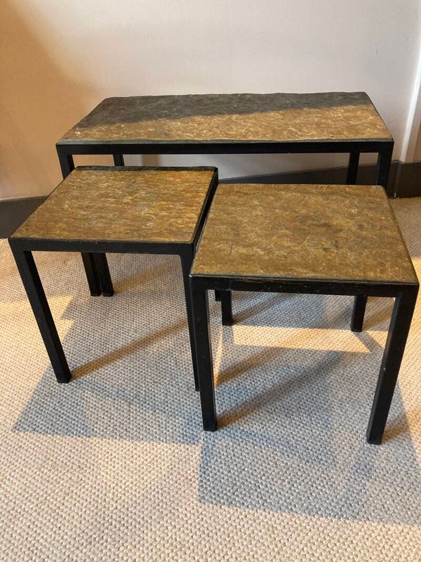 Een groter rechthoekig model en twee kleinere vierkante exemplaren. Leisteen blad in een zwart metalen frame.