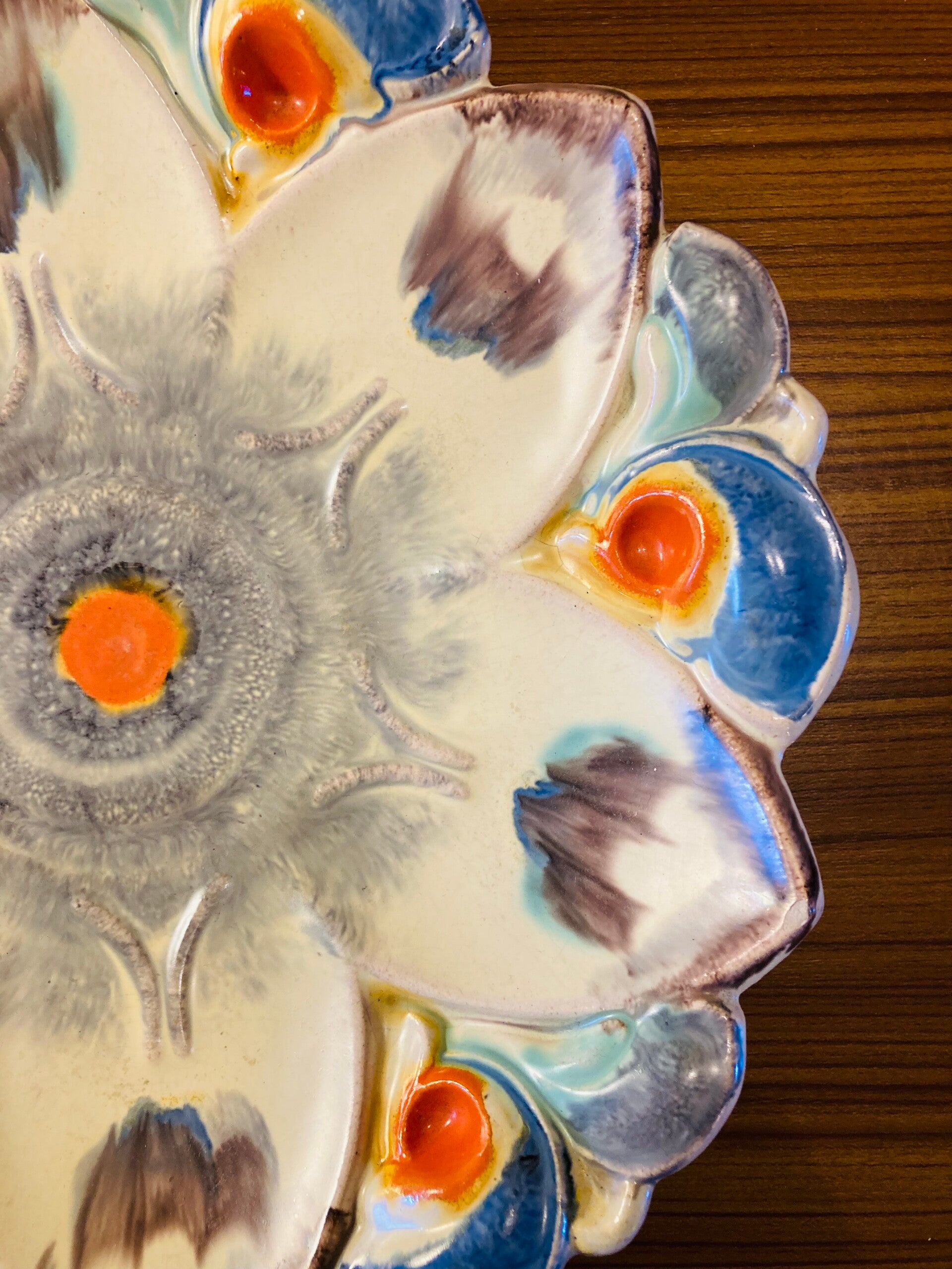 Prachtige keramieken schaal, jaren '60, waarschijnlijk West-Germany. Met een kleurrijk en vlammend geglazuurd dessin.