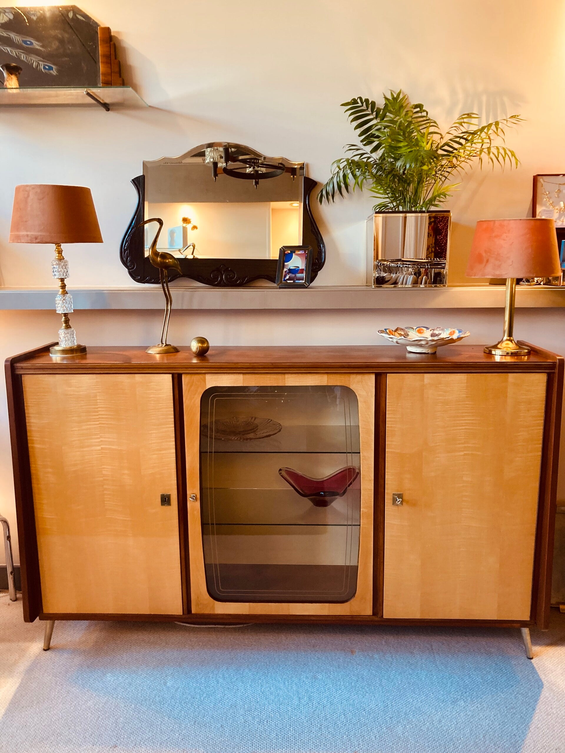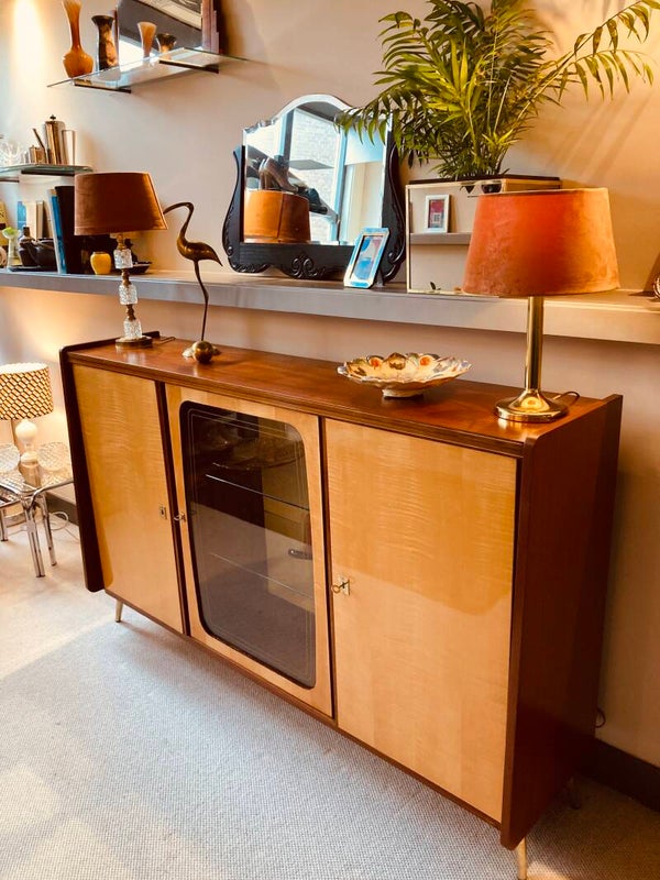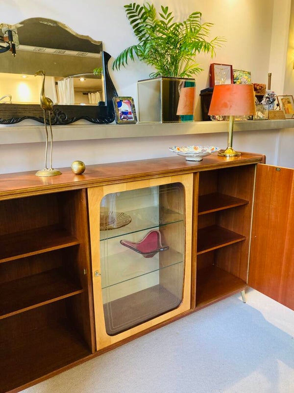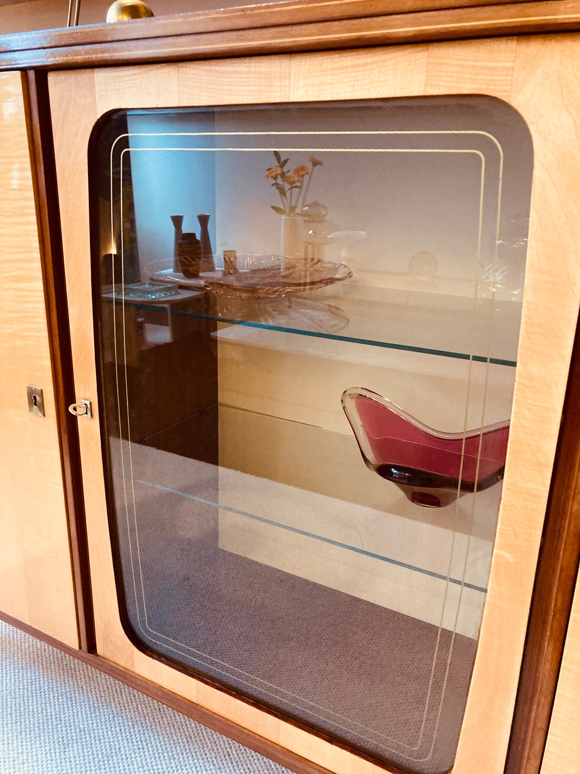 Gelakt esdoorn fineer en teakhout vormen een warme combinatie voor deze Duitse kast van Bröcker. Messing pootjes en een mooi asymmetrisch vitrinekast deurtje met gouden belijning, maken het geheel af.