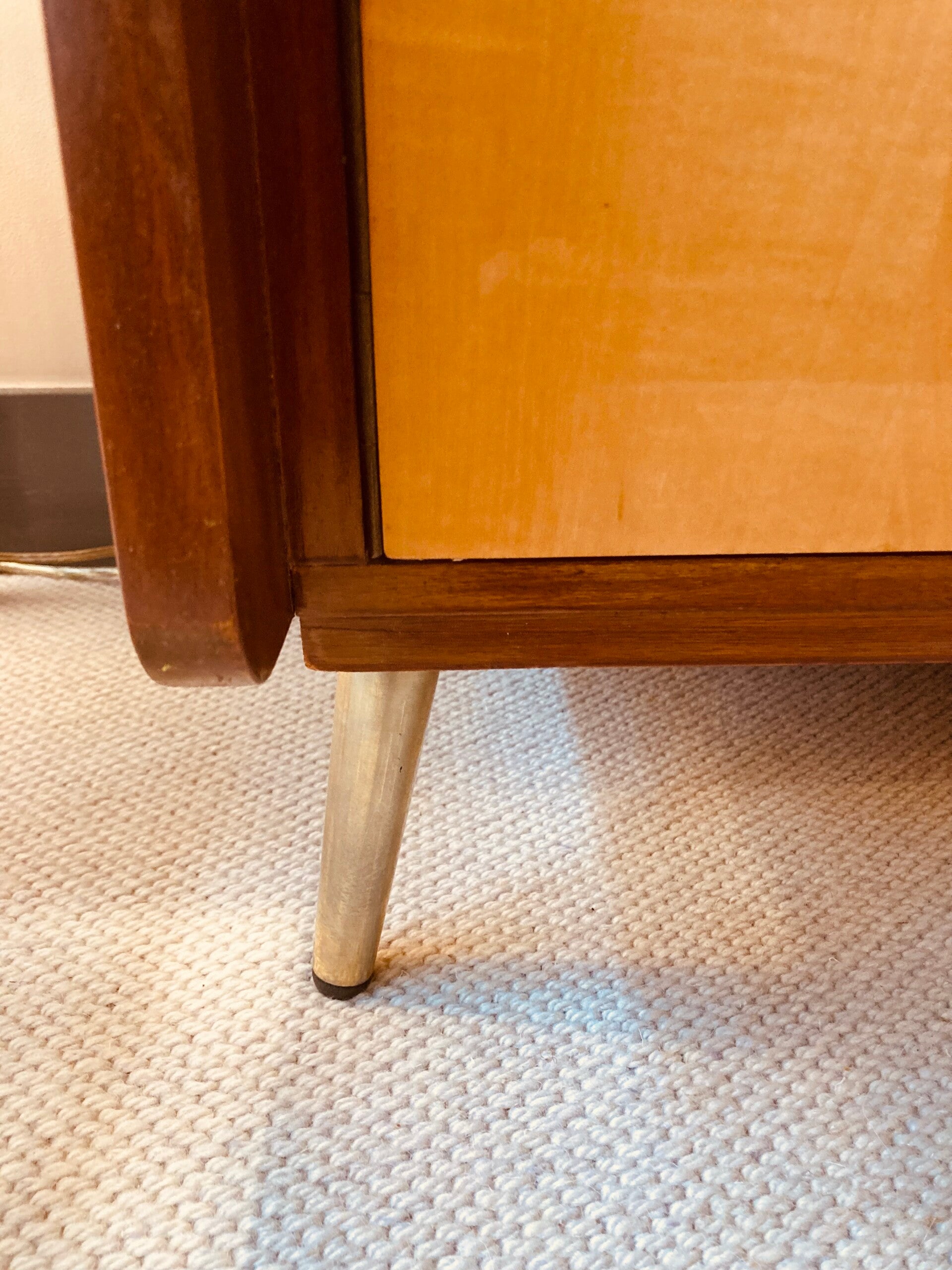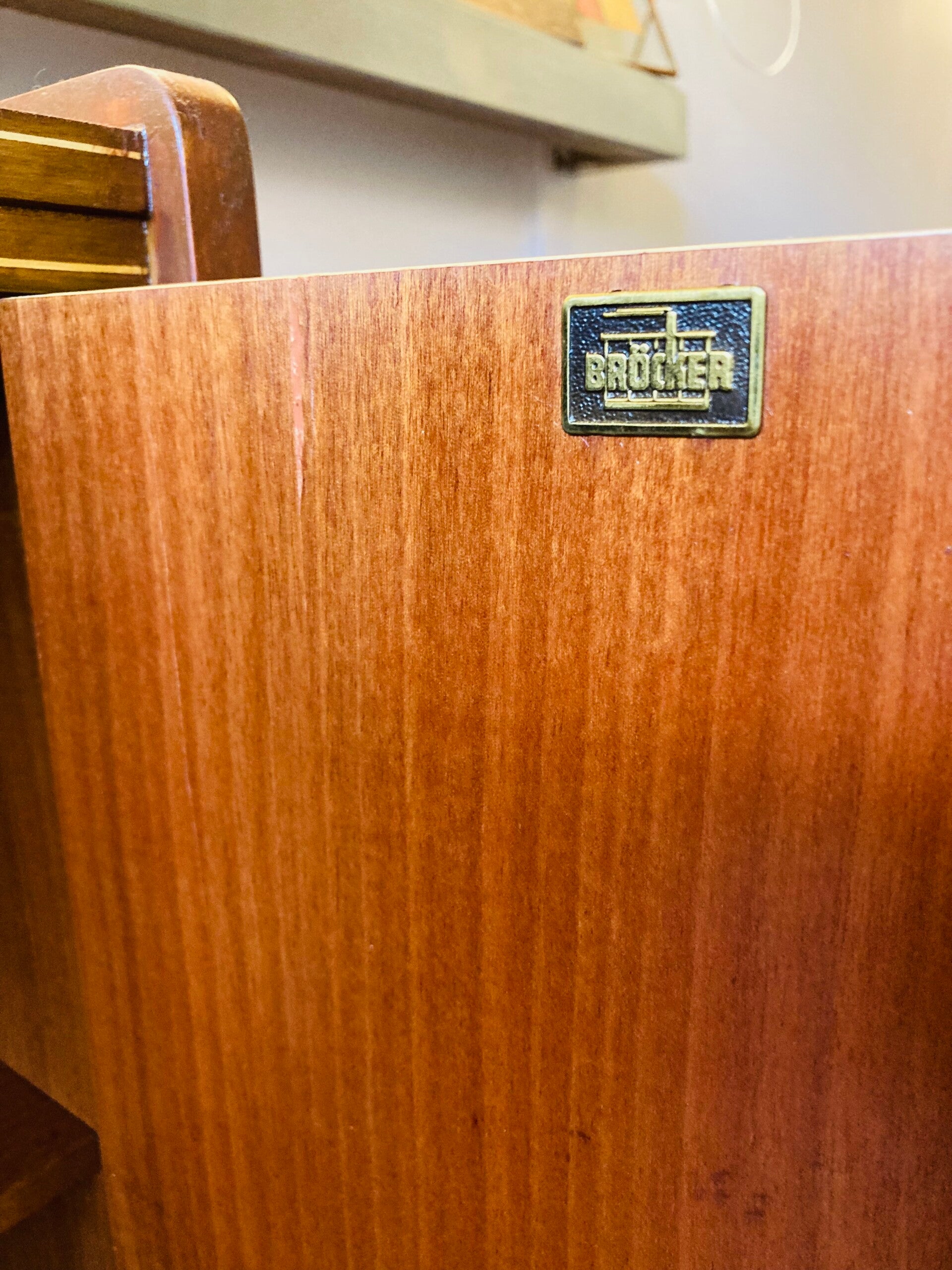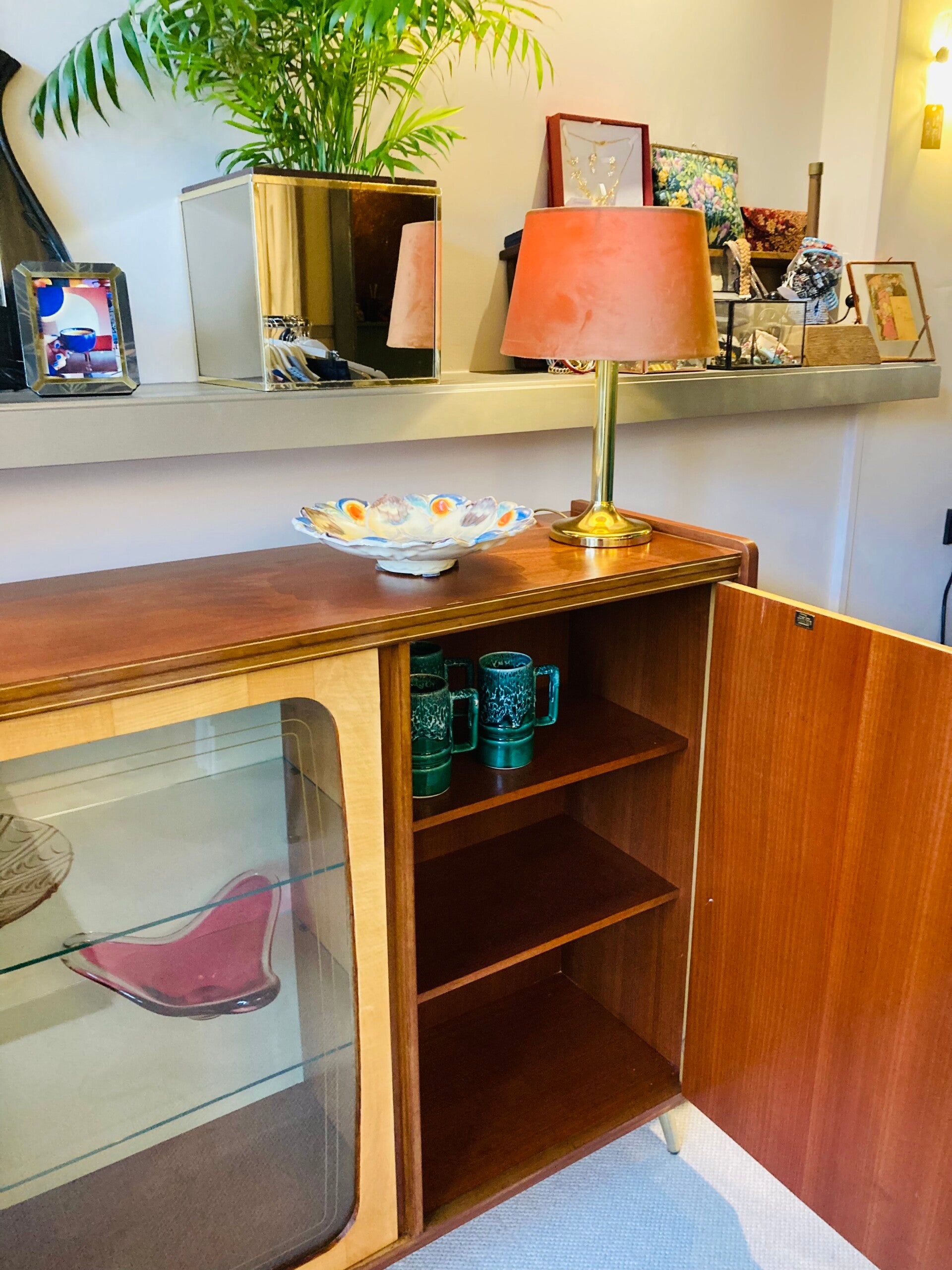 Gelakt esdoorn fineer en teakhout vormen een warme combinatie voor deze Duitse kast van Bröcker. Messing pootjes en een mooi asymmetrisch vitrinekast deurtje met gouden belijning, maken het geheel af.