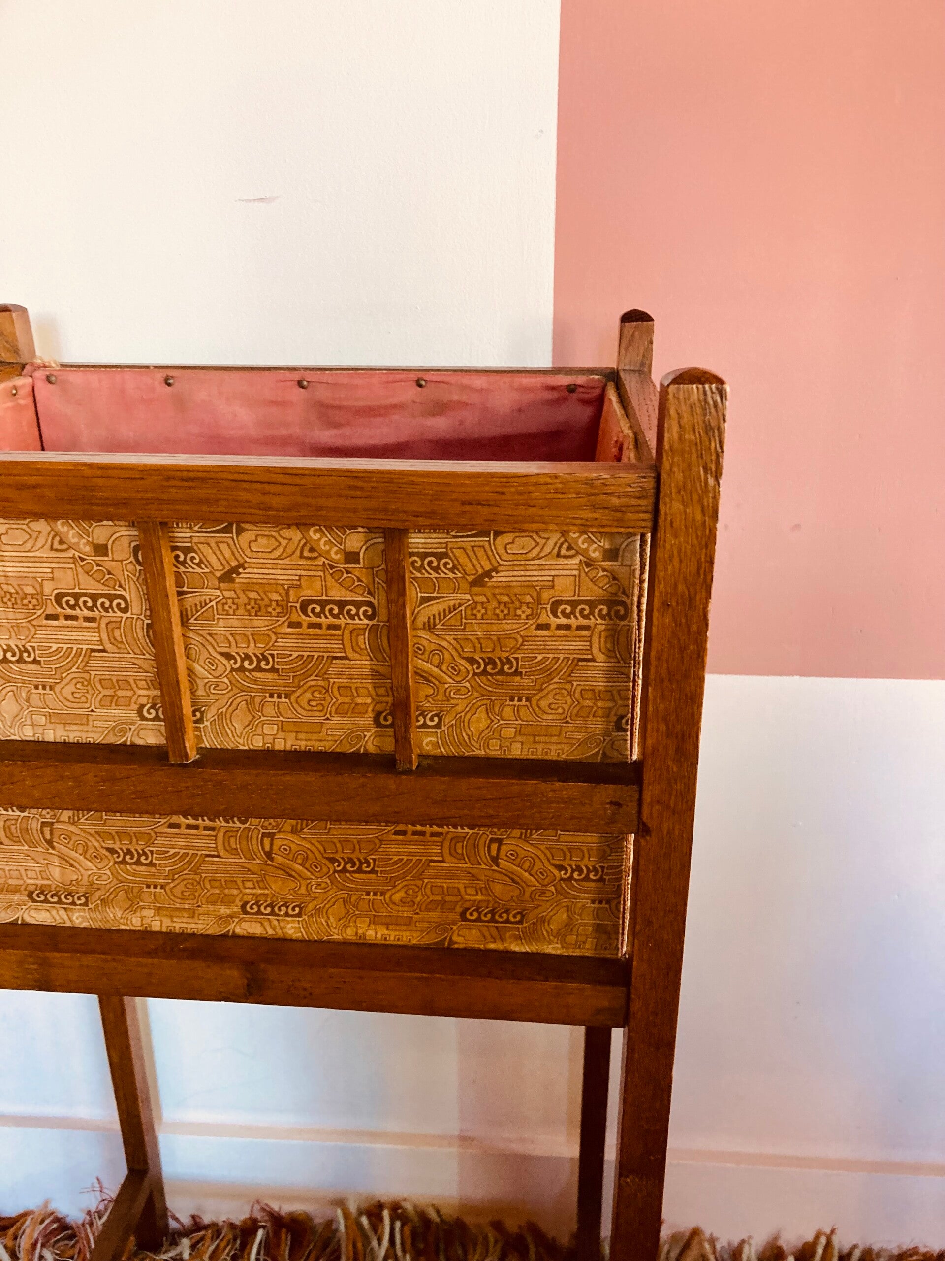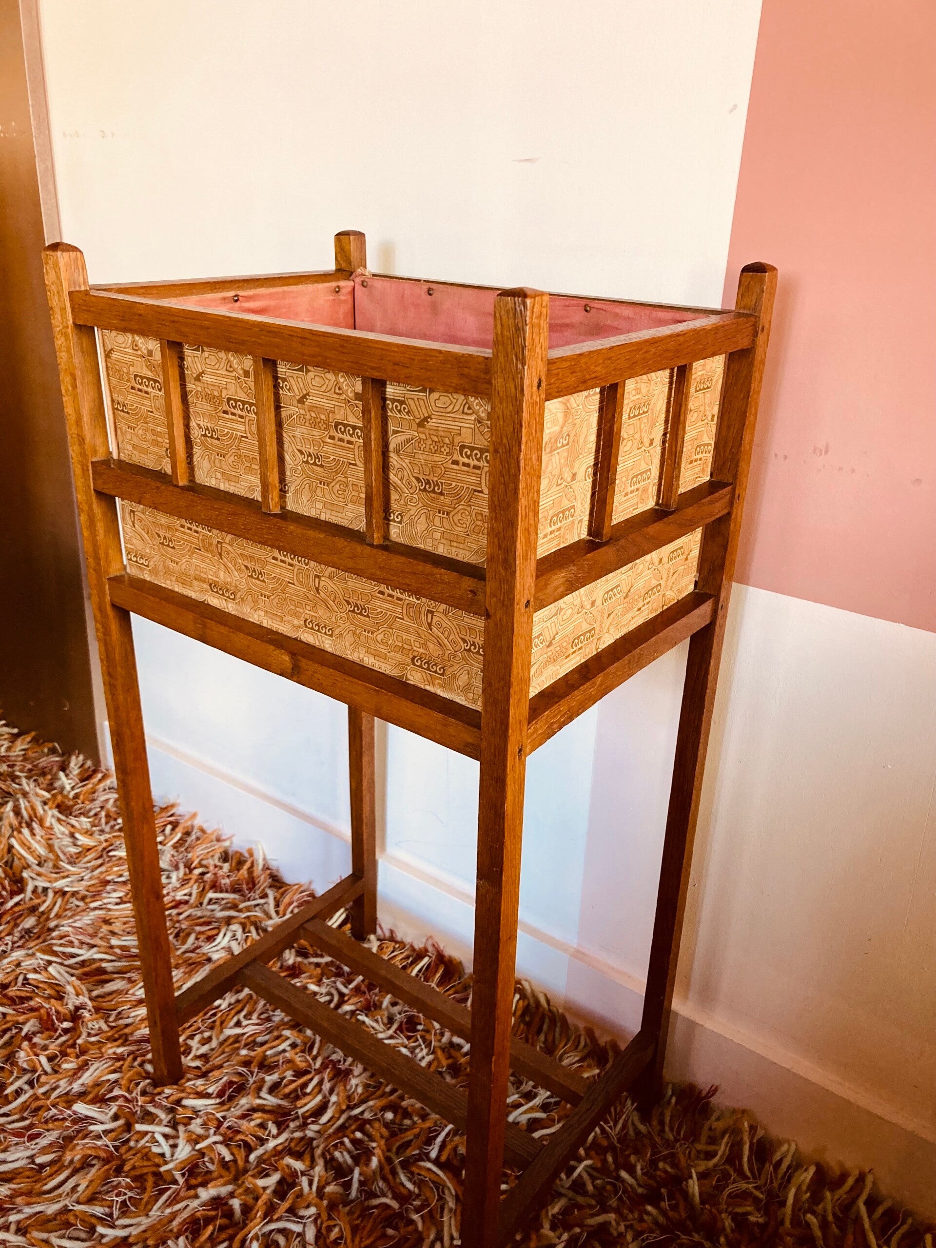 Een charmant en gekkig meubel van eikenhout, met een gedessineerd zijdeachtig stoffen buitenkant met bijzonder patroon.