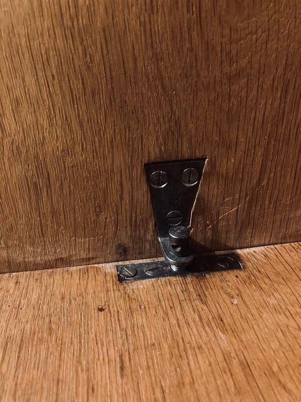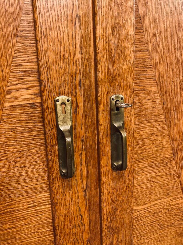 Originele, messing handgrepen en metalen scharnieren. De deuren zijn gedecoreerd met een stijlvol ruitpatroon en een lamellenpatroon aan de onderzijde.