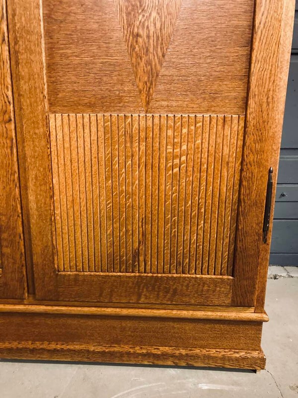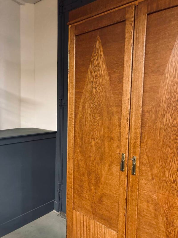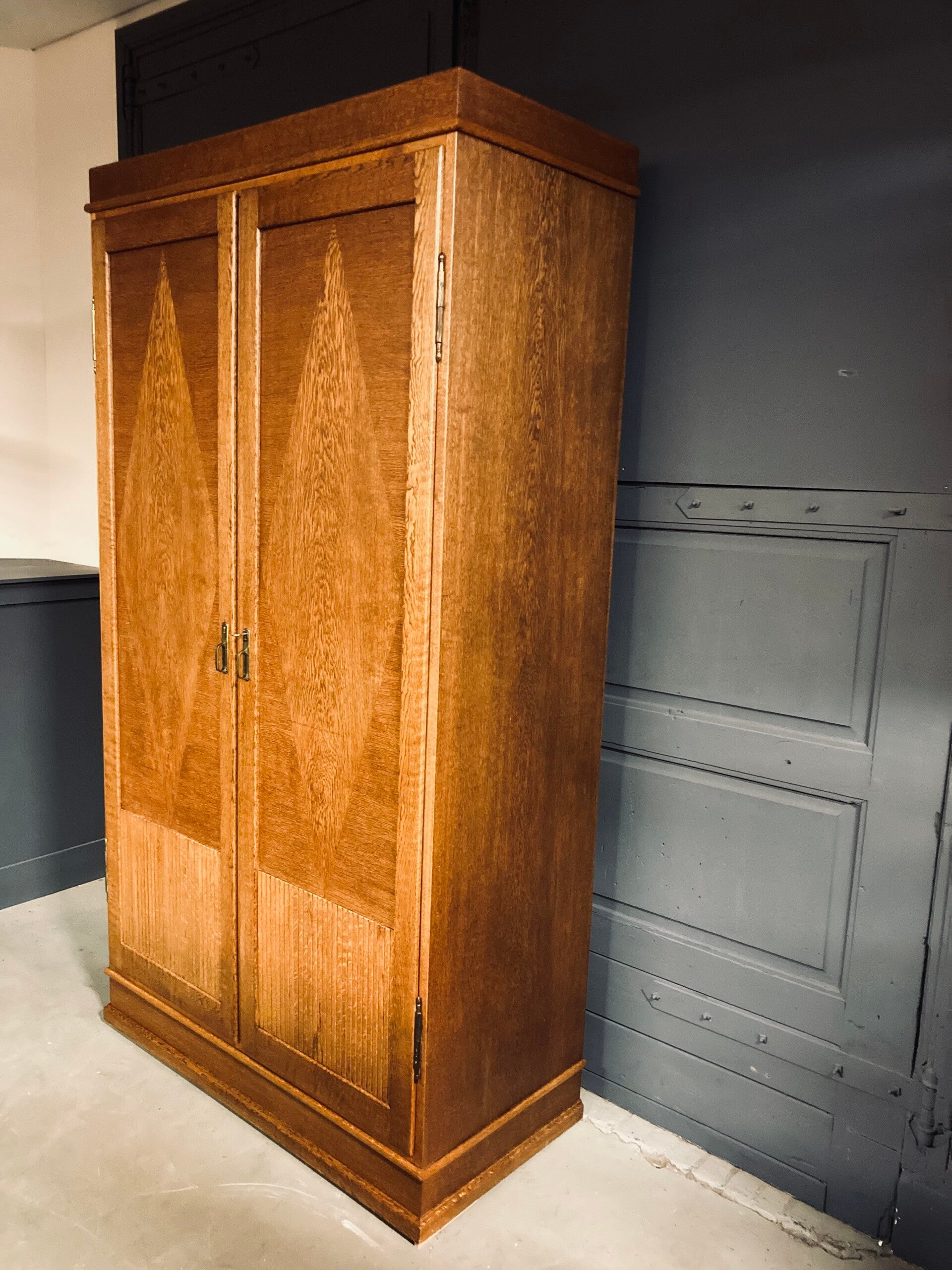 Art Deco tweedeurs kledingkast, uitgevoerd in warm eiken, een combinatie van massief en gefineerd.