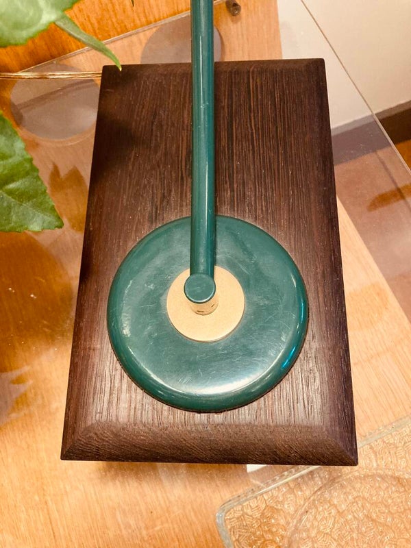 De sierlijke ranke boog vormt de verbinding tussen kap en voet van donkergroen gelakt metaal met messing details.