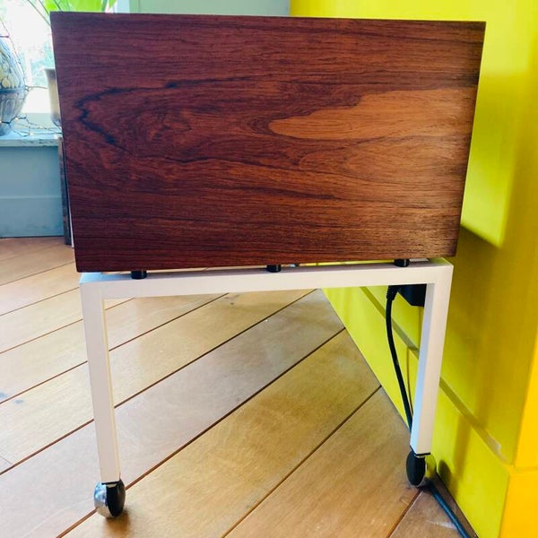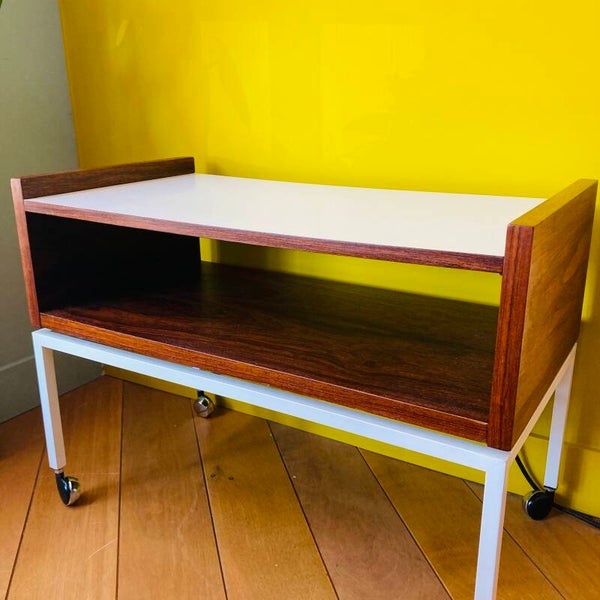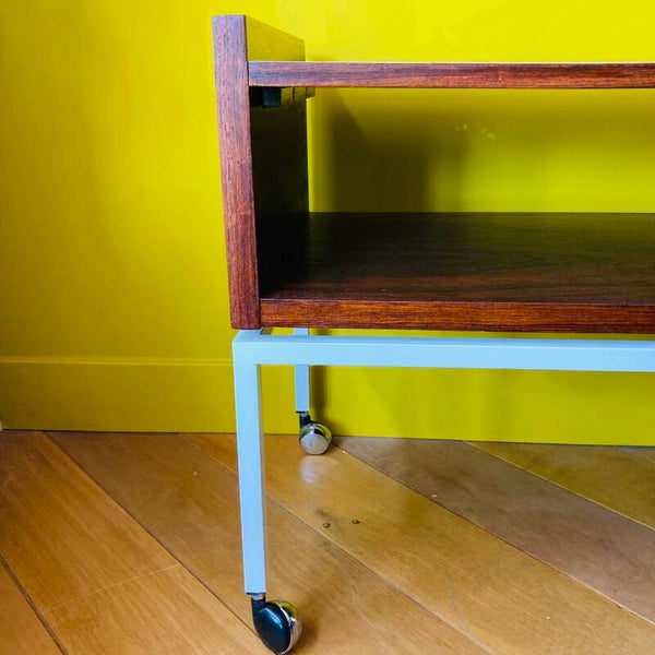 Frisse, lichte jaren ‘70 trolley, in heel mooie staat met wit gelamineerd bovenblad en teak onderblad op een wit metalen frame.