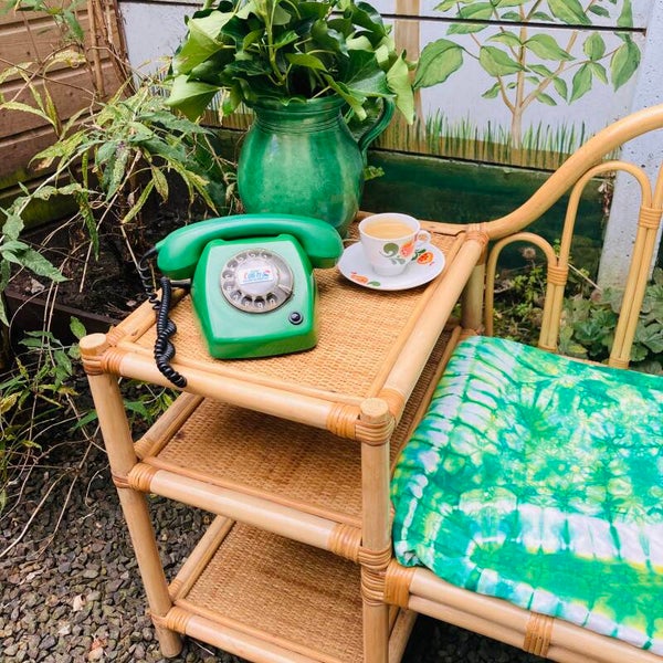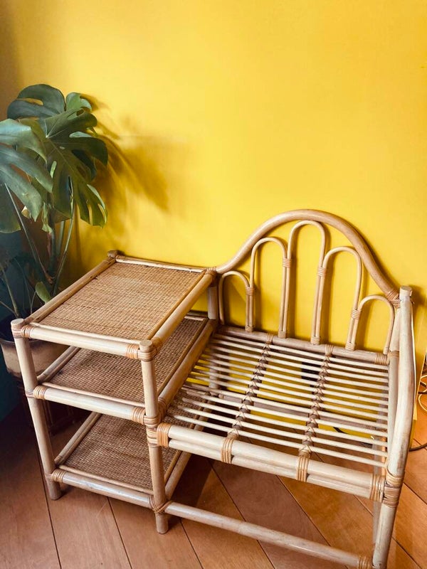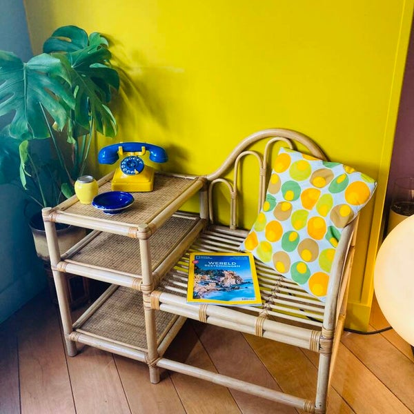 Een sfeermaker, dit veel te leuke jaren ‘70 rotan / bamboe telefoonbankje!