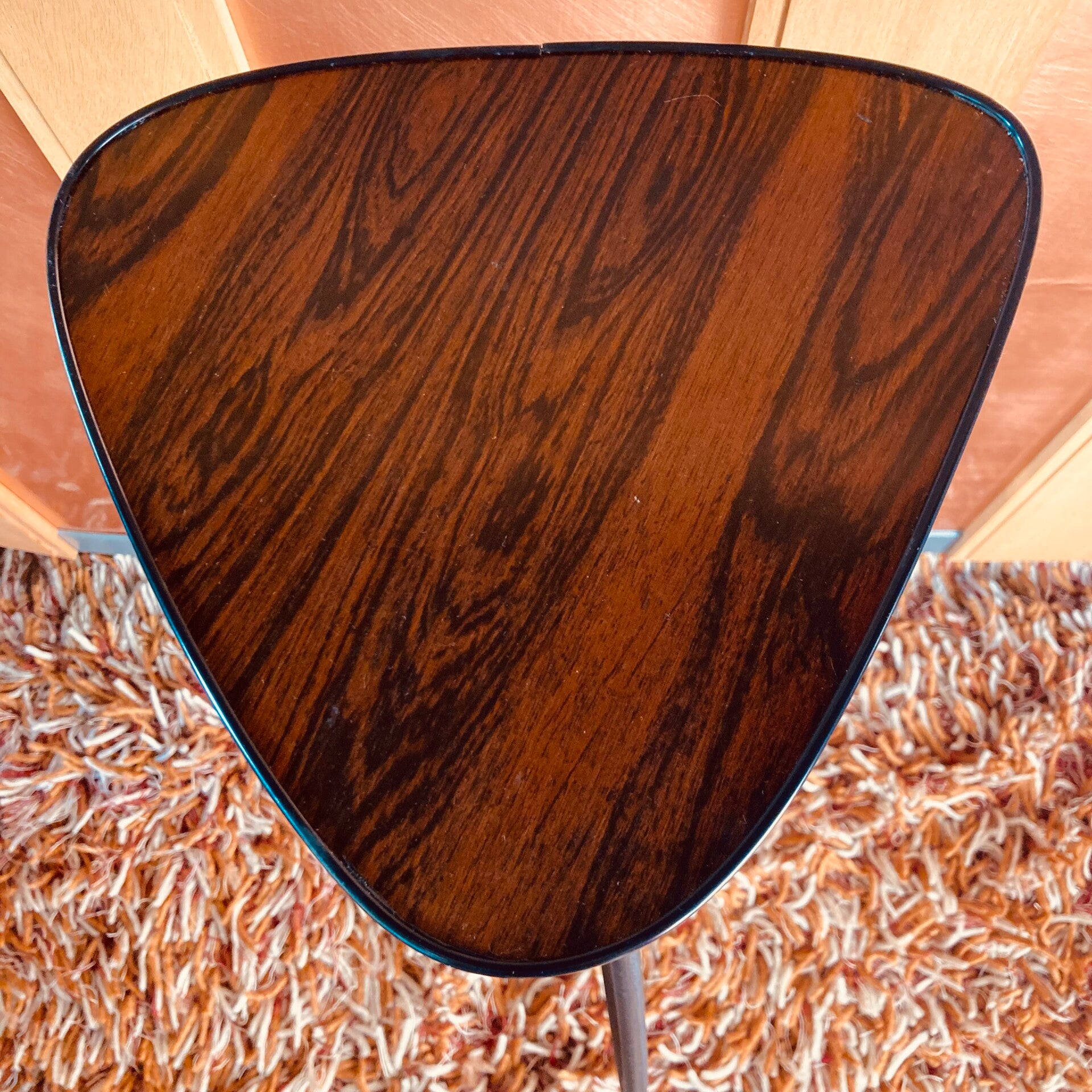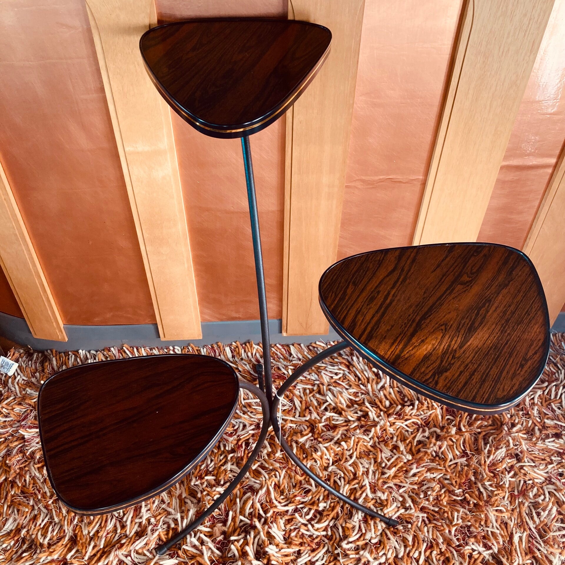 De bladen zijn palissander fineer met een prachtige tekening, afgewerkt met een messing rand, op een zwart metalen onderstel.
