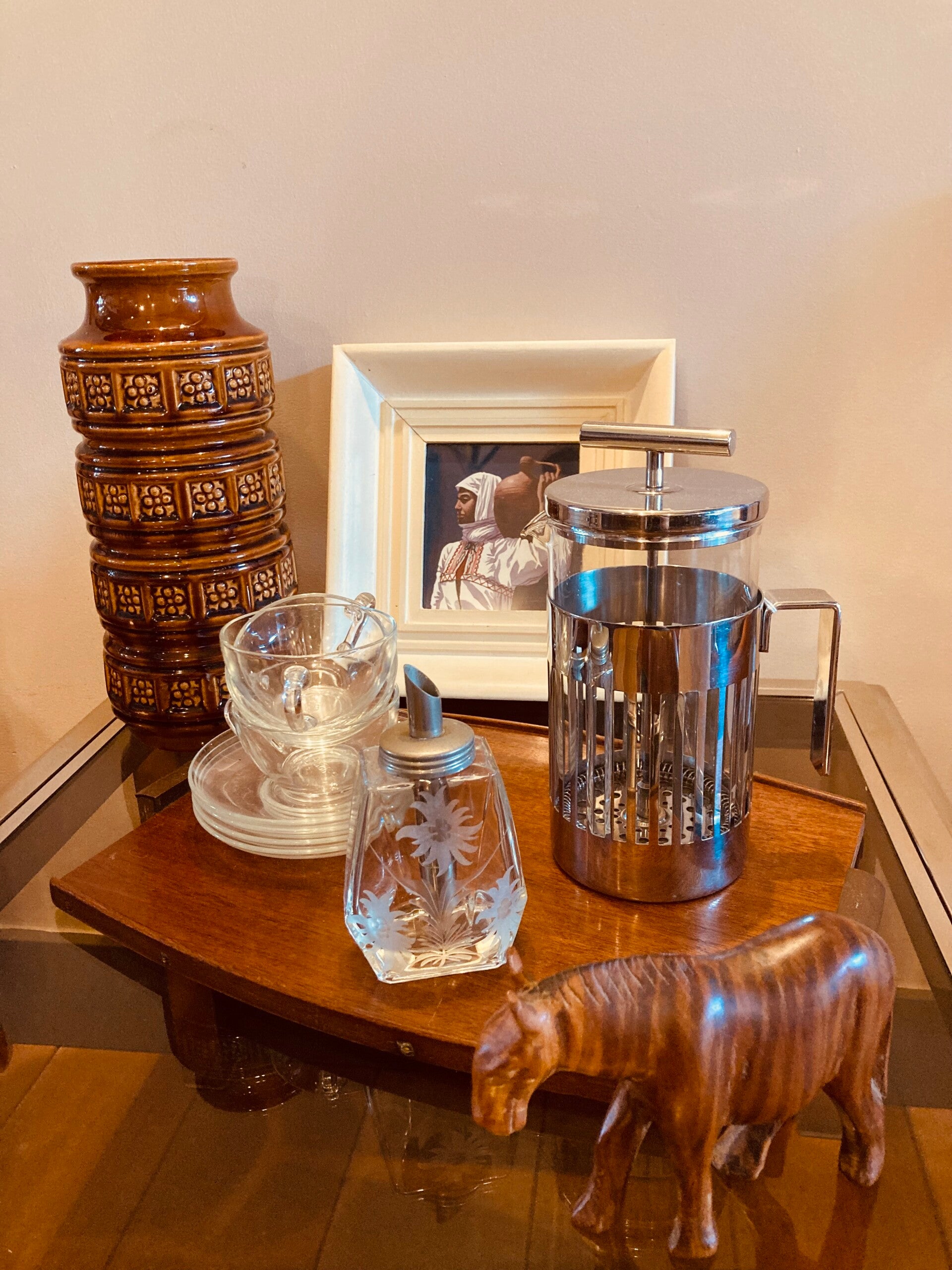 Afbeelding van een vrouw met waterkruik, in oosterse sferen, in sprekende heldere kleuren.