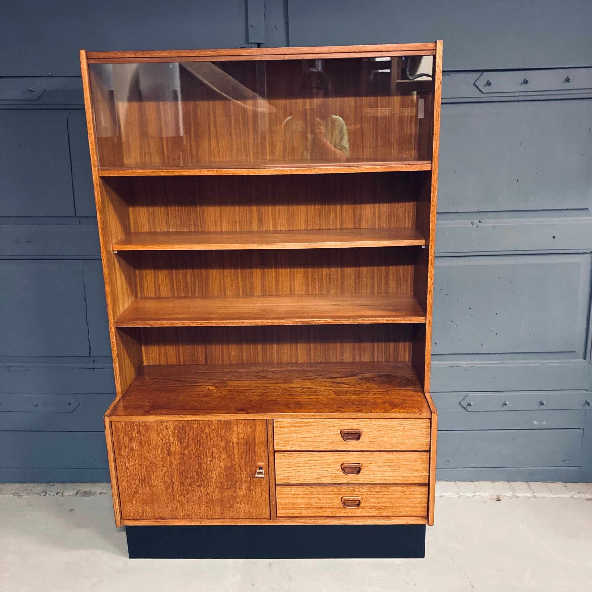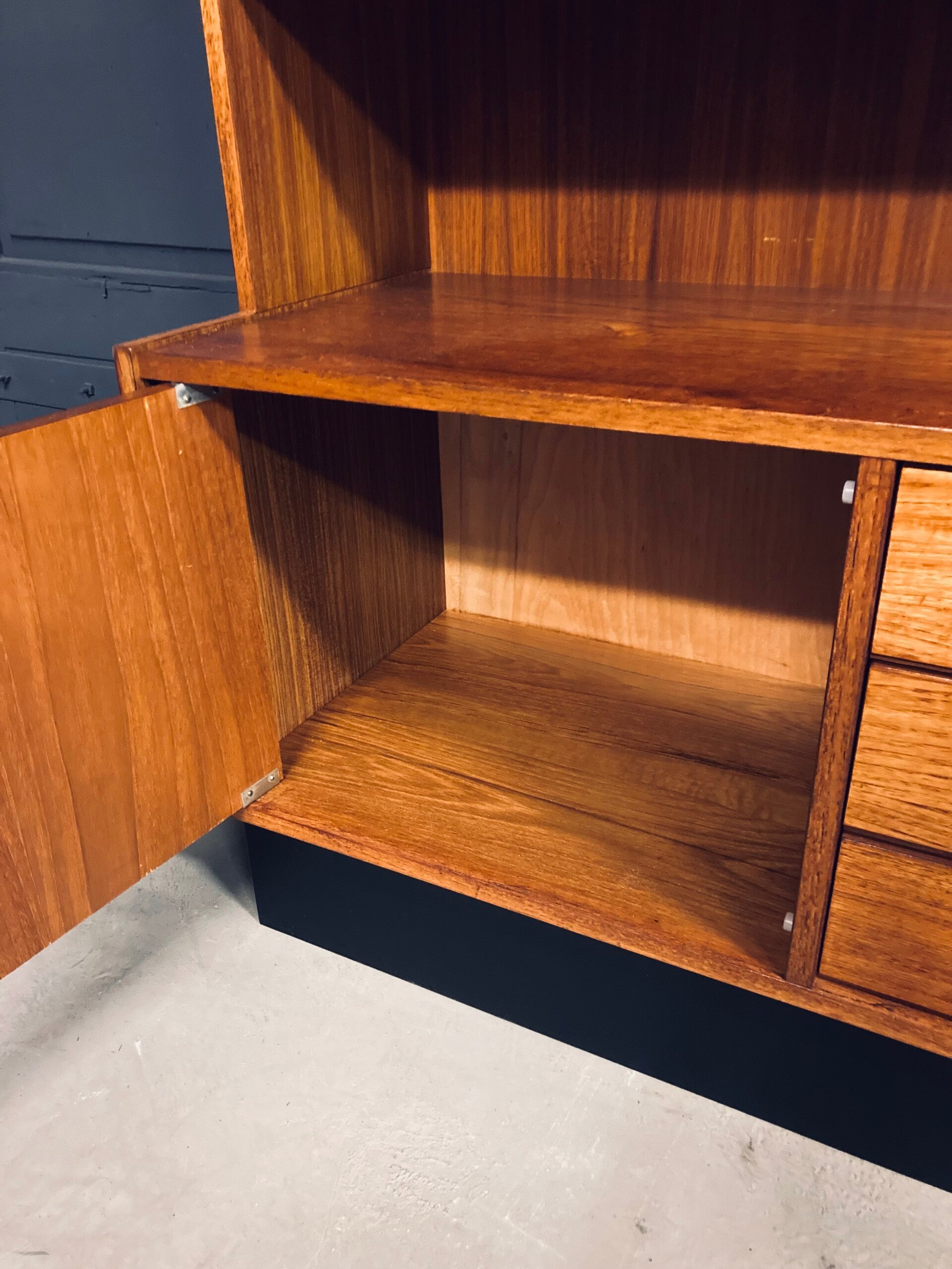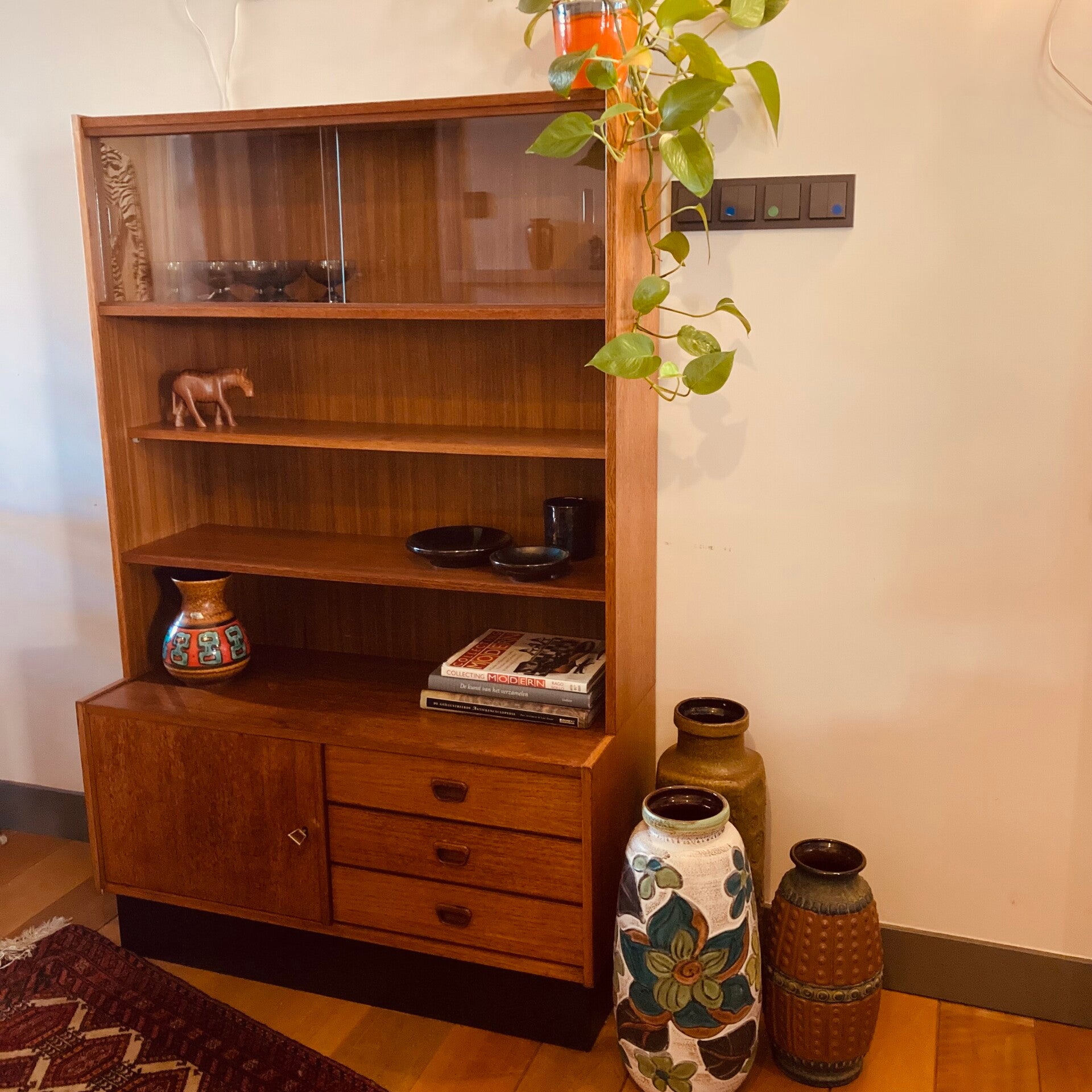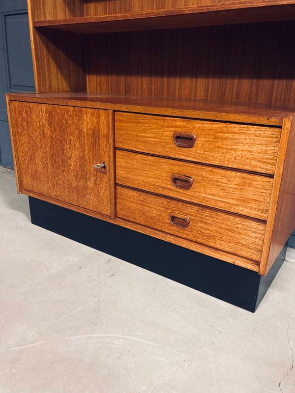 Een mooi klein ding in heel goede vintage conditie en ondanks het compacte formaat heeft de kast veel bergruimte met z’n 3 lades, planken, een kastdeel en een vitrine waar je je mooie glaswerk in kan tentoonstellen.