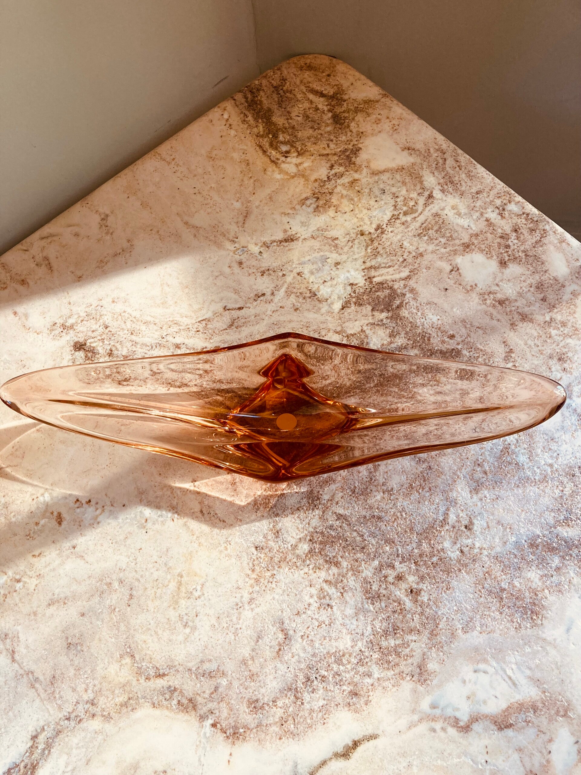 Sierlijk jaren '60 schaaltje uitgevoerd in Rosaline glas in een soort van 'splash' vorm.