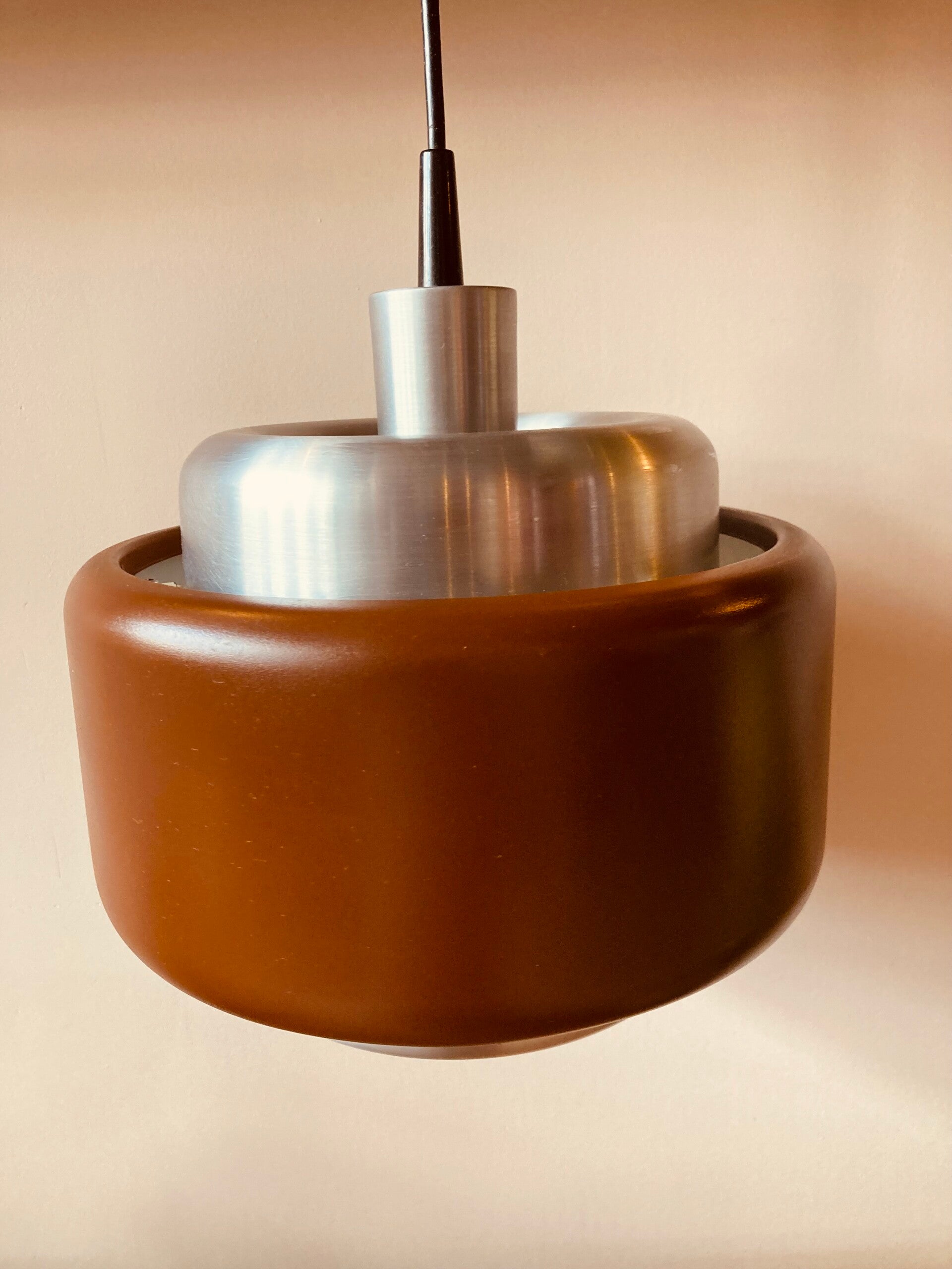 Geborsteld aluminium cilinder met een gekleurde aluminium buitenring in een warm kastanjebruin. De ringen hebben mooi afgeronde vormen.