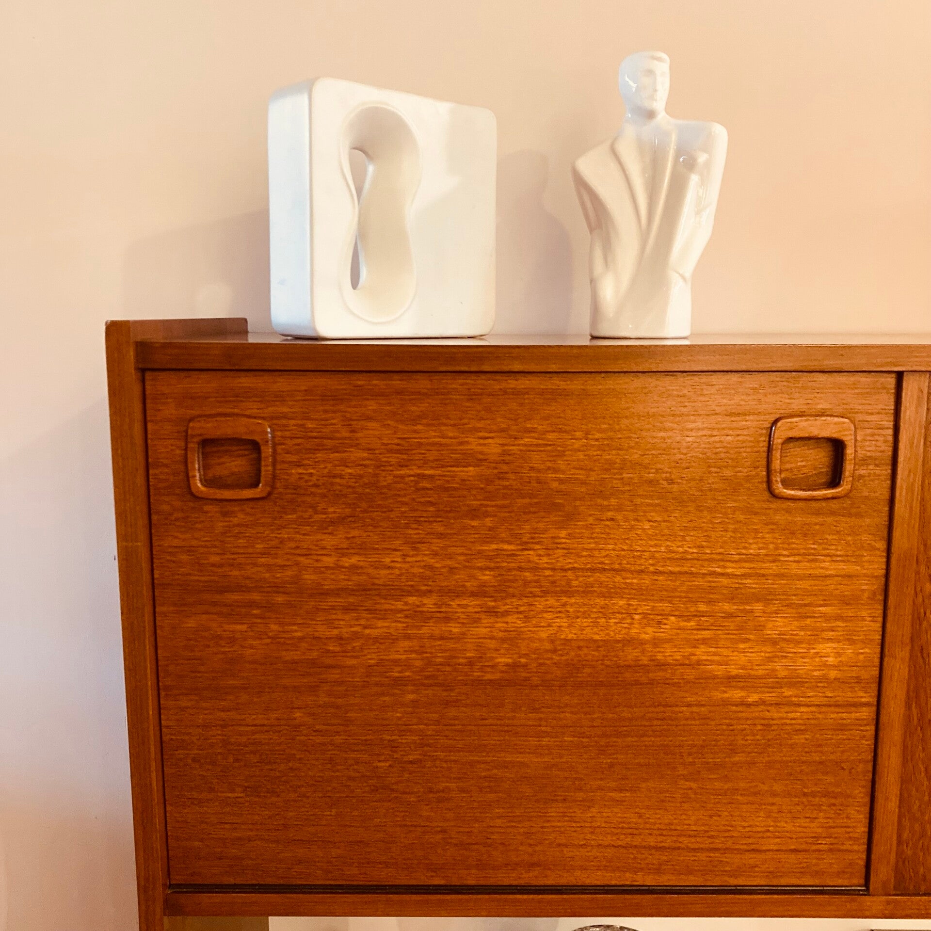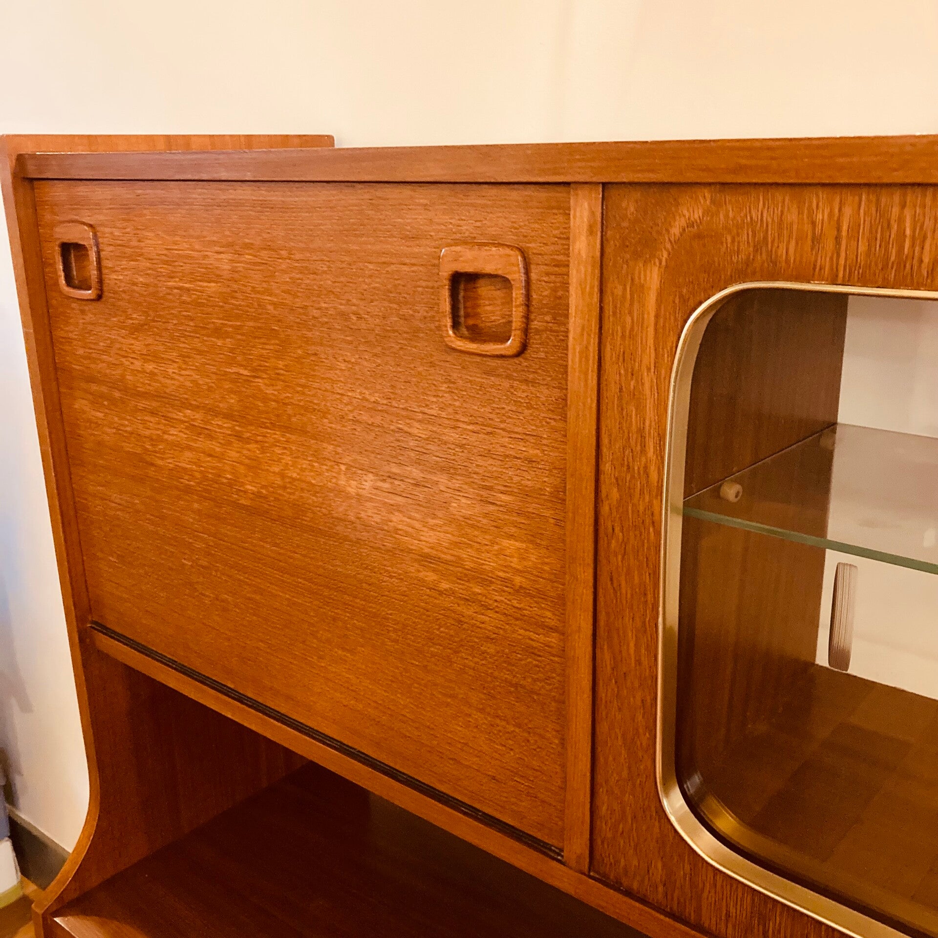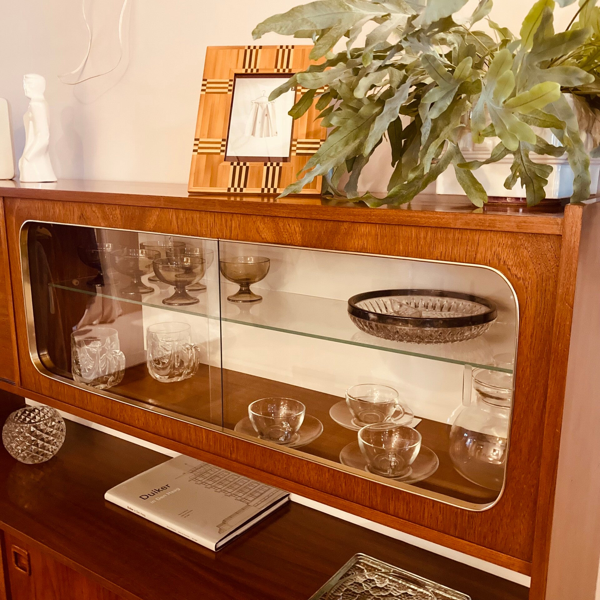 Ik vind het een knapperd dit vintage highboard / buffetkast van teakhout met z’n bescheiden vitrine met de mooi afgeronde hoeken en messing afgewerkte rand.