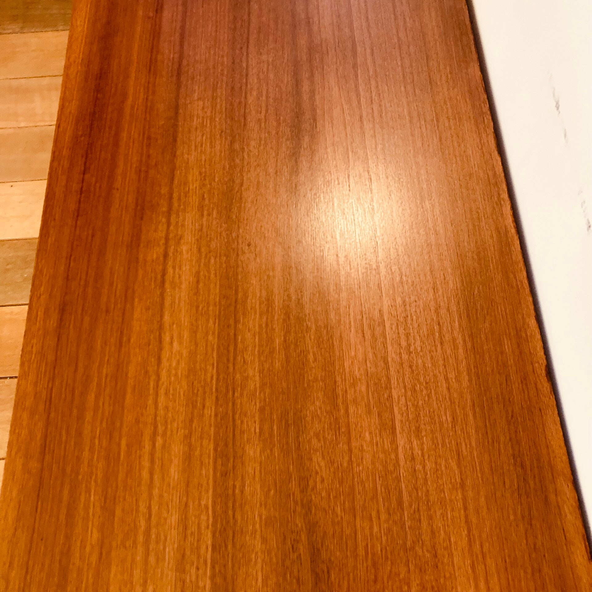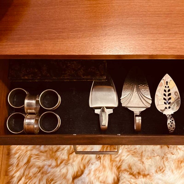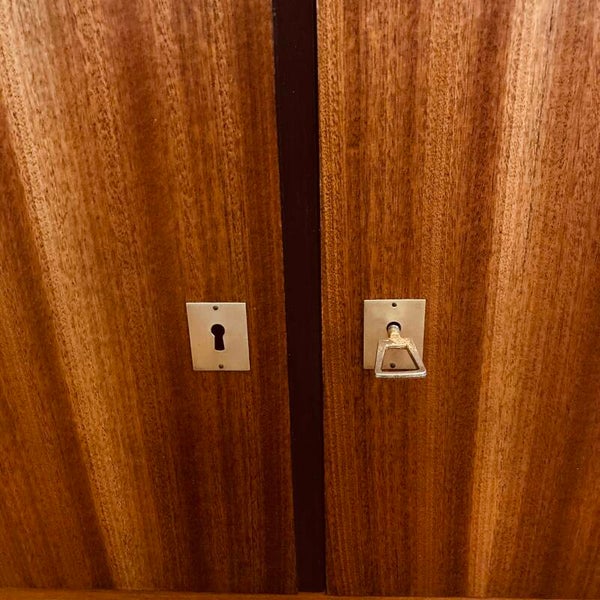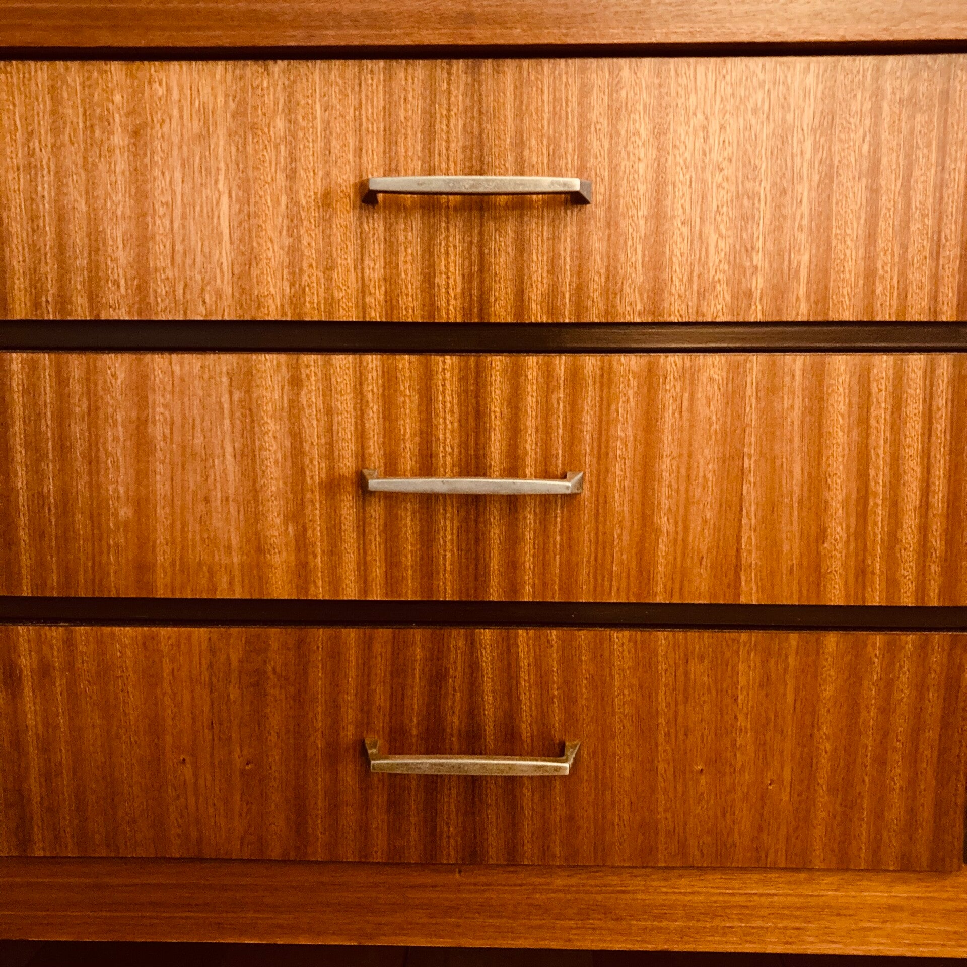 In de lades vind je nog het originele vilt in goede staat, zoals eigenlijk het hele dressoir, en de originele messingkleurige handgrepen.