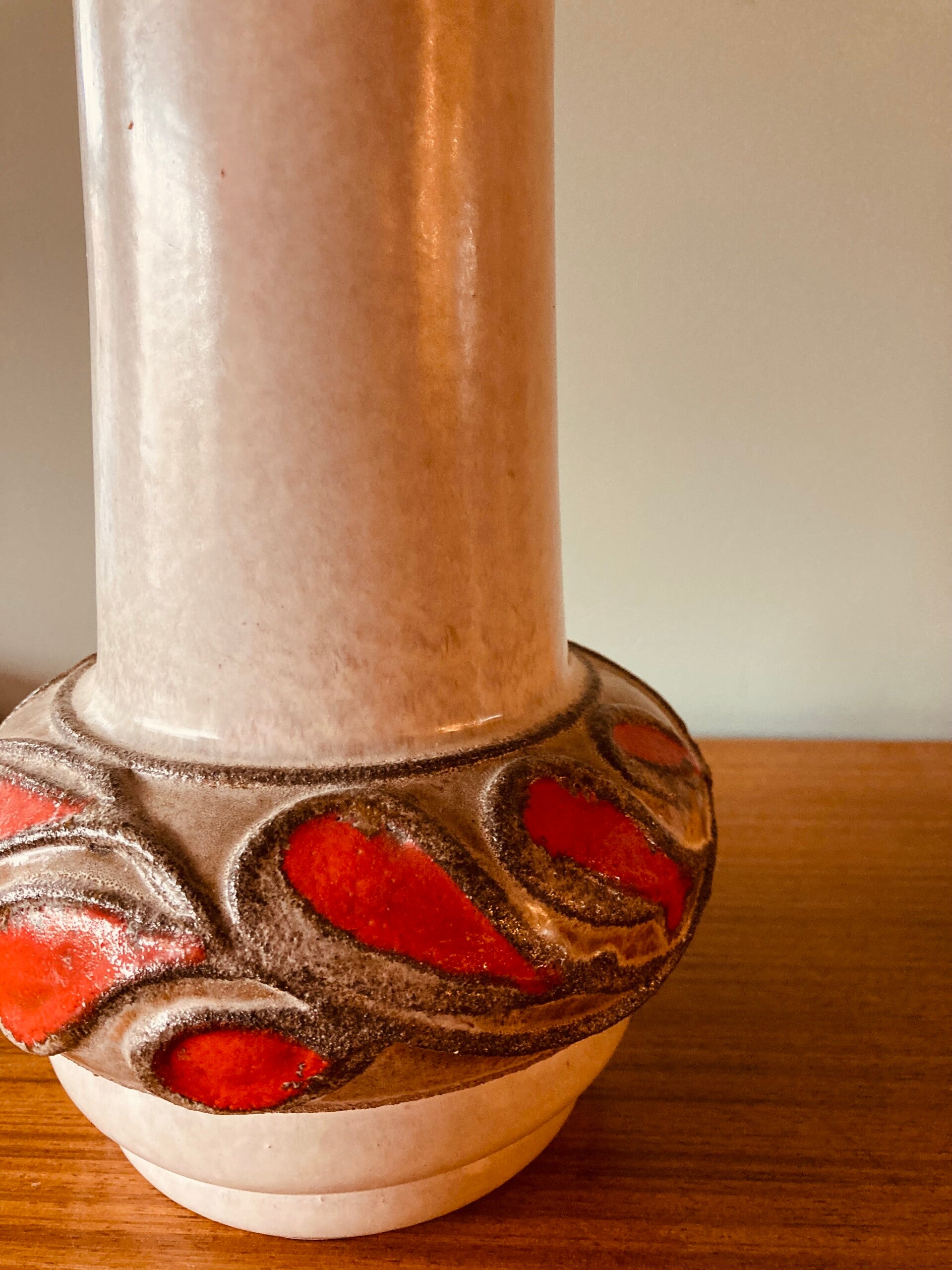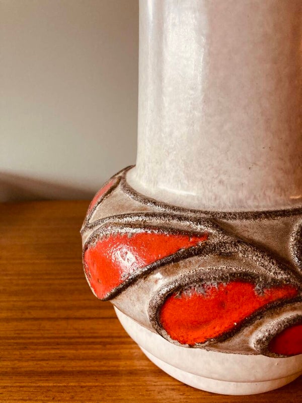 Leuke mid-century Strehla tafelvaas met een vrolijk oranje/rood reliëf dessin. Geglazuurd keramiek.