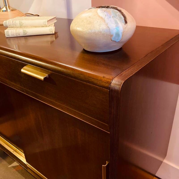Uitgevoerd in warm notenhout, met schuifdeuren en 2 lades, zacht afgeronde hoeken met ribbelpatroon en messing handgrepen en details.