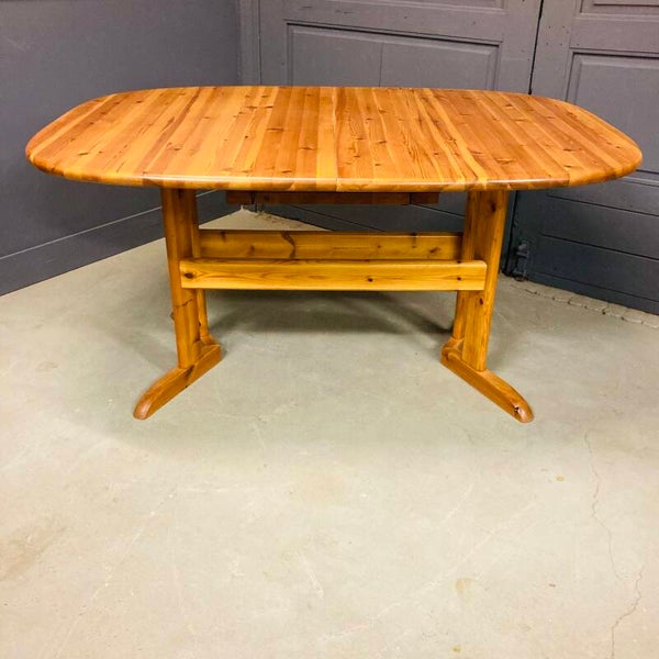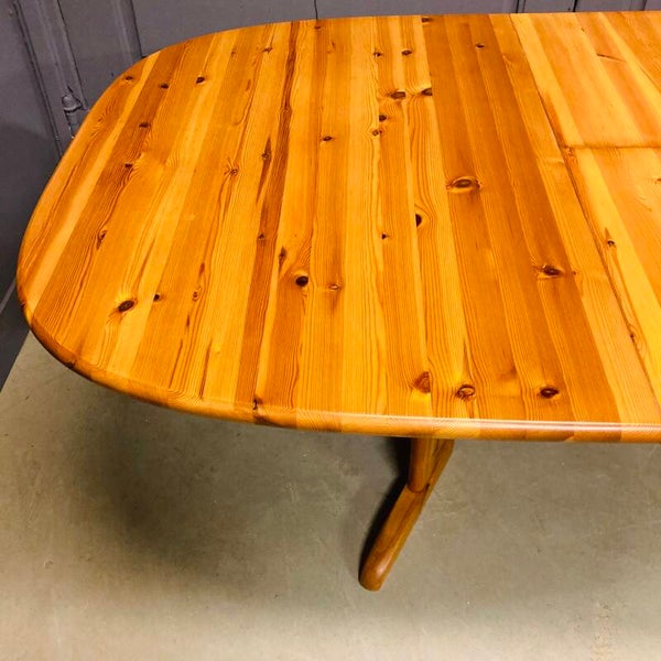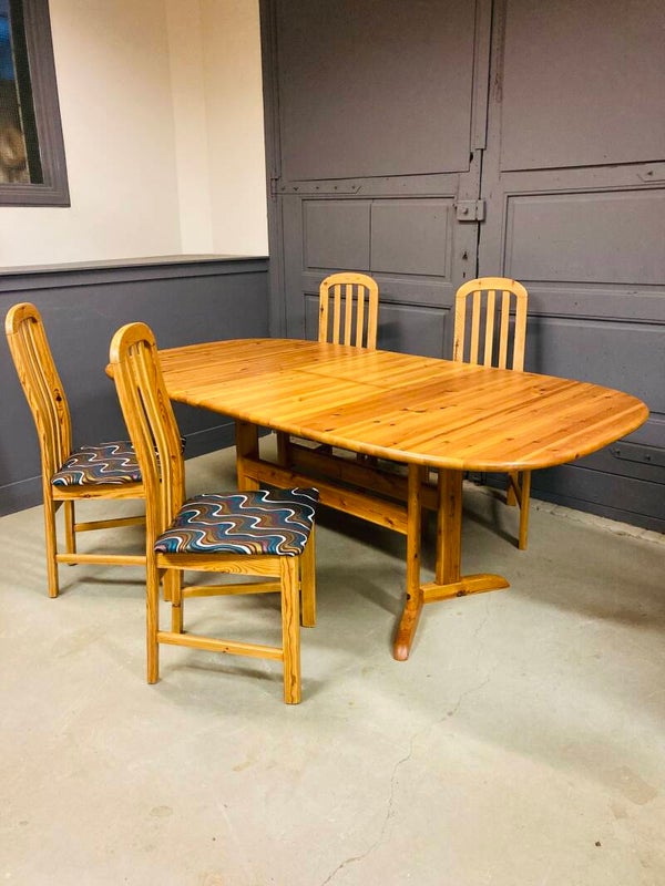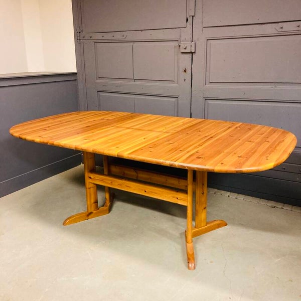 De ovale tafel van vurenhout, voor 4 tot 6 personen, is eenvoudig uit te schuiven waarna je er ruim met 8 personen aan kan plaatsnemen.