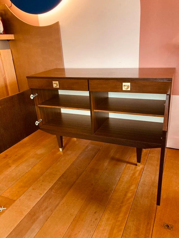 De bergruimte in dit jaren ‘60/‘70 meubel met de 2 lades en kastjes geven het weer de benodigde functionaliteit: slim en mooi!