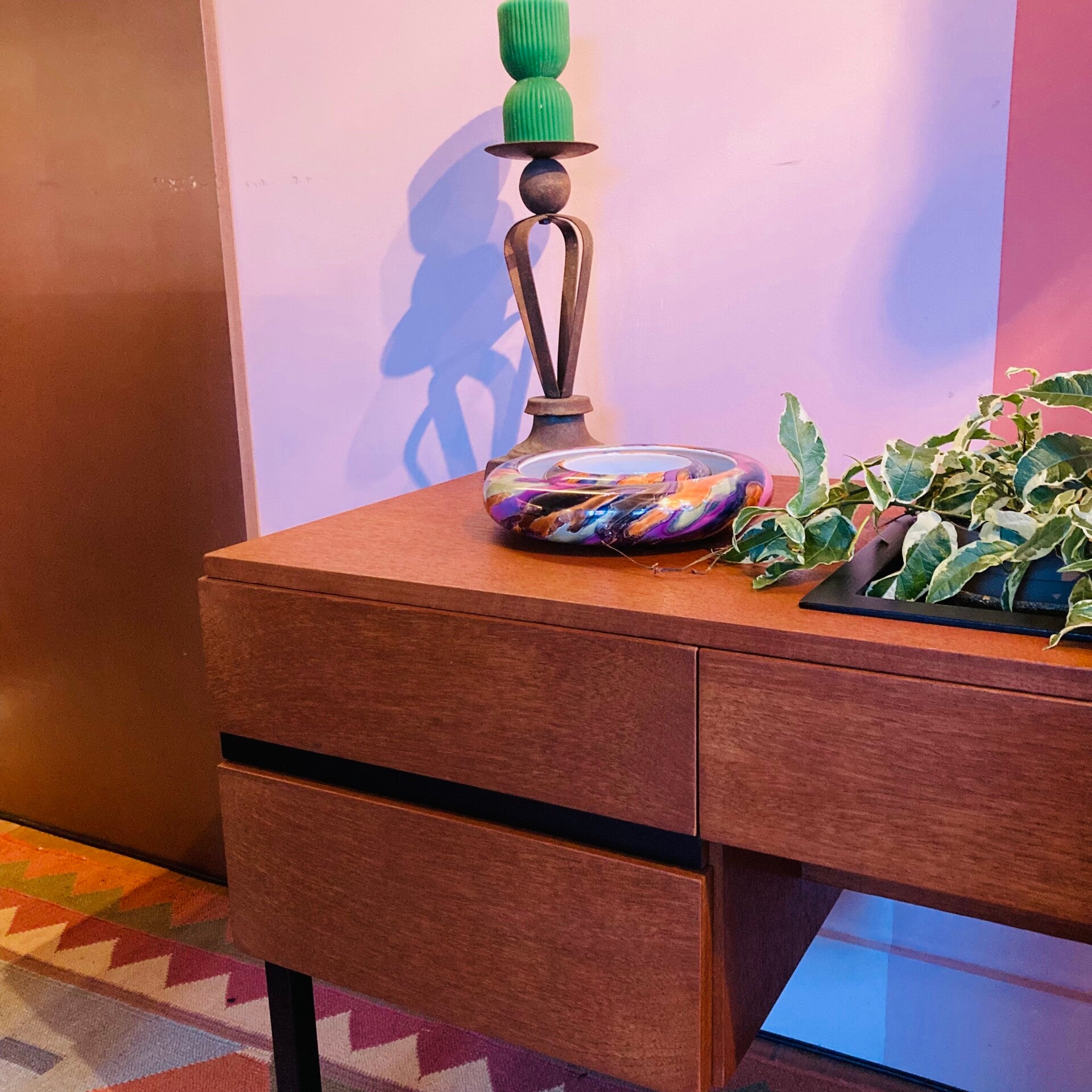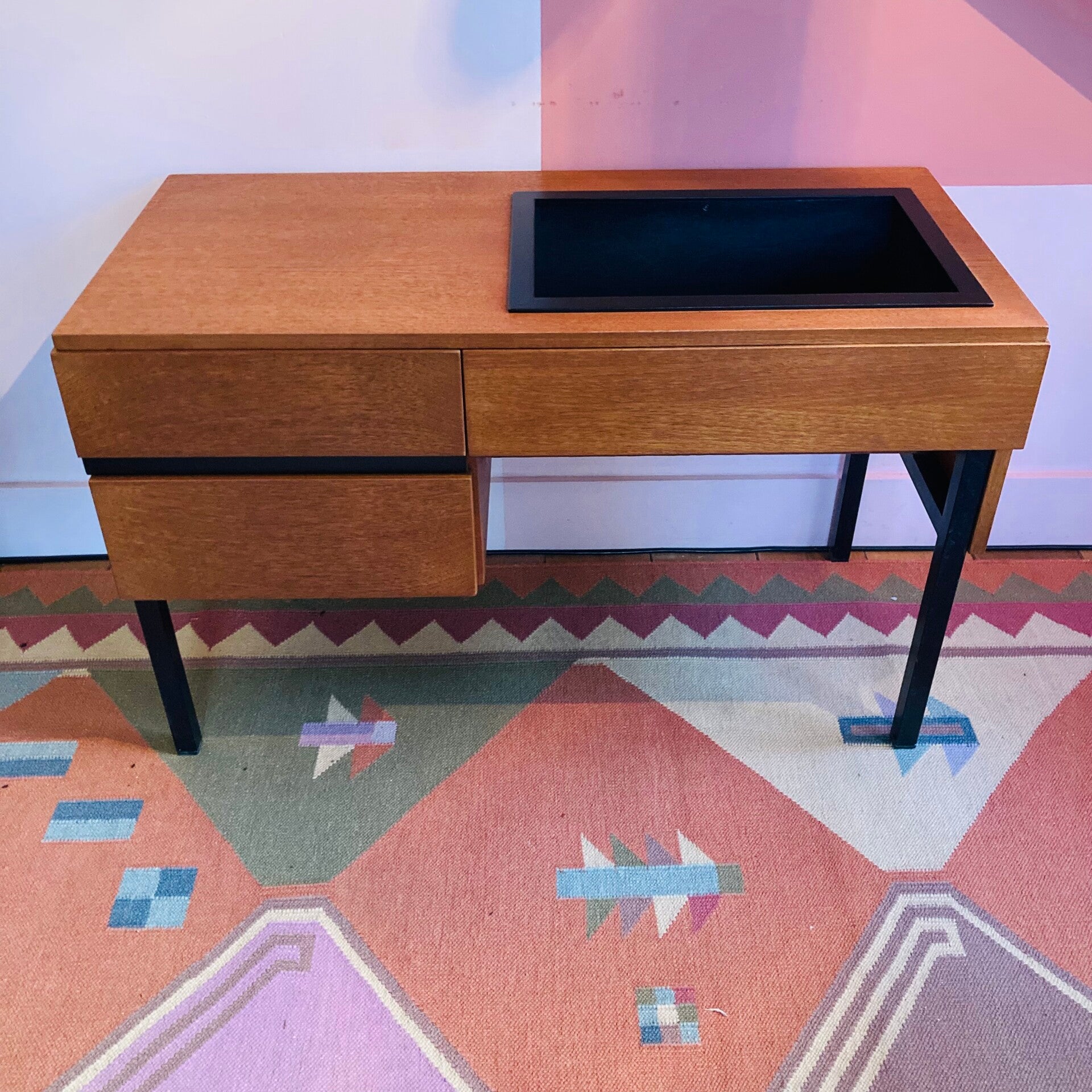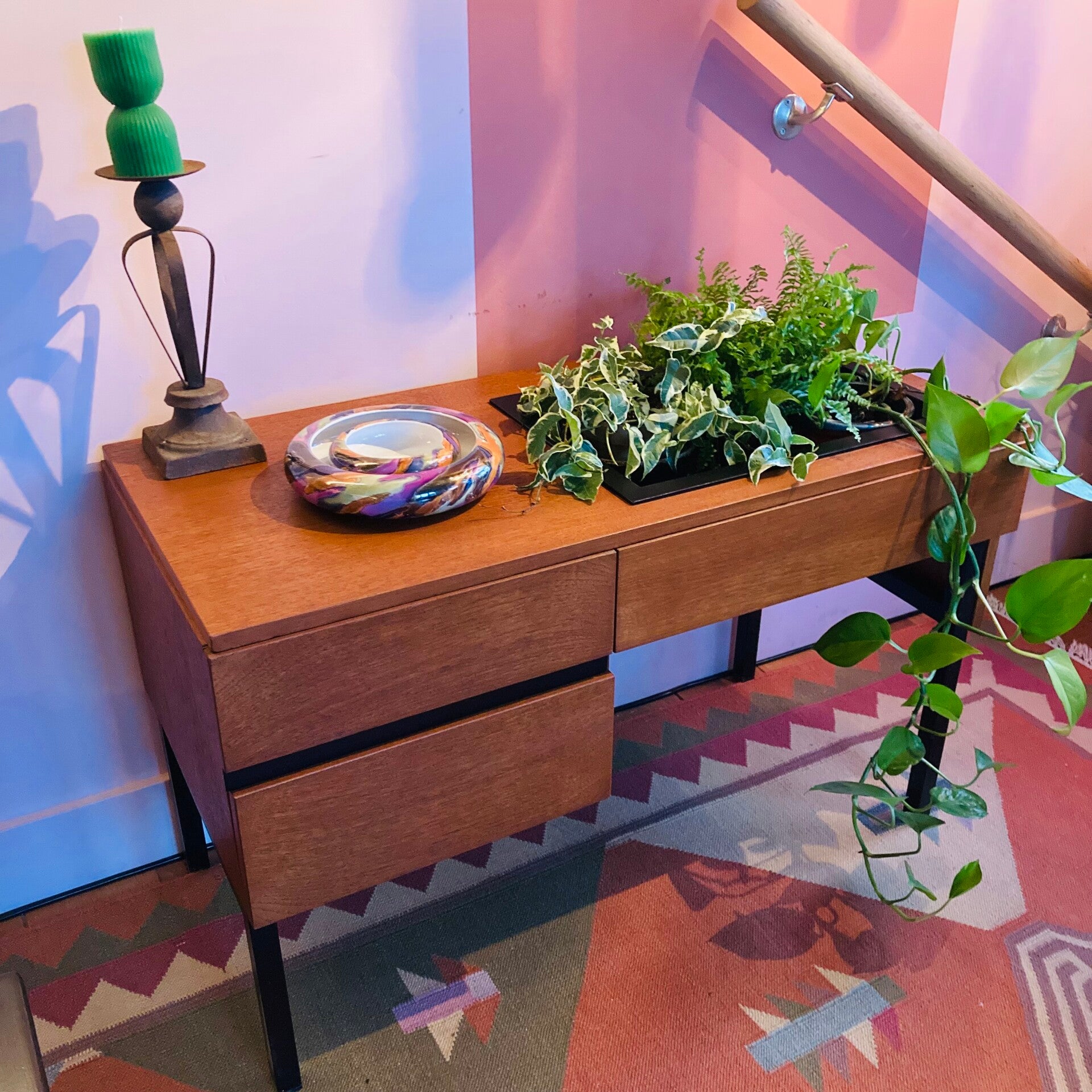 Uitgevoerd in een warm teak fineer, 2 lades voor opbergruimte, op een zwart metalen frame.