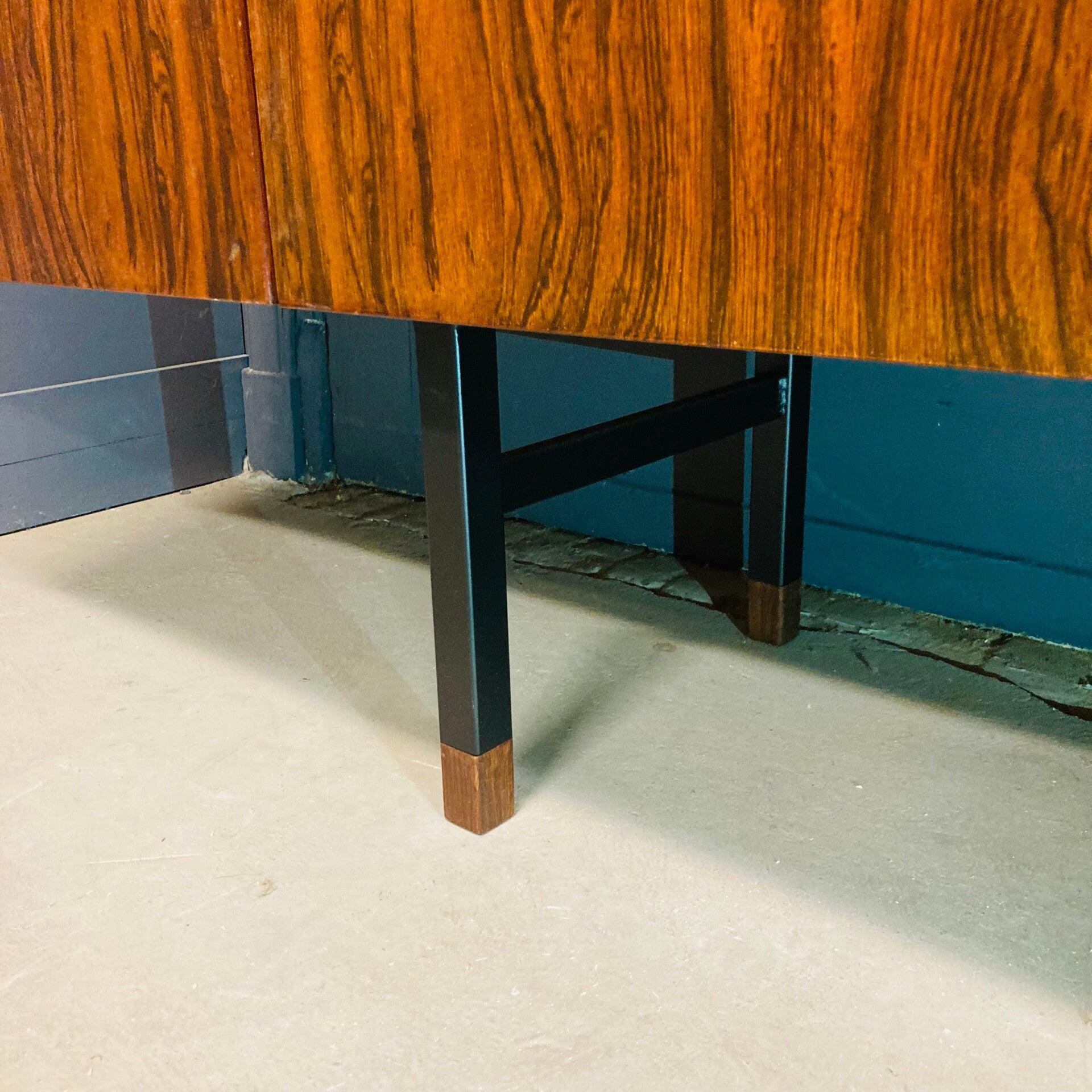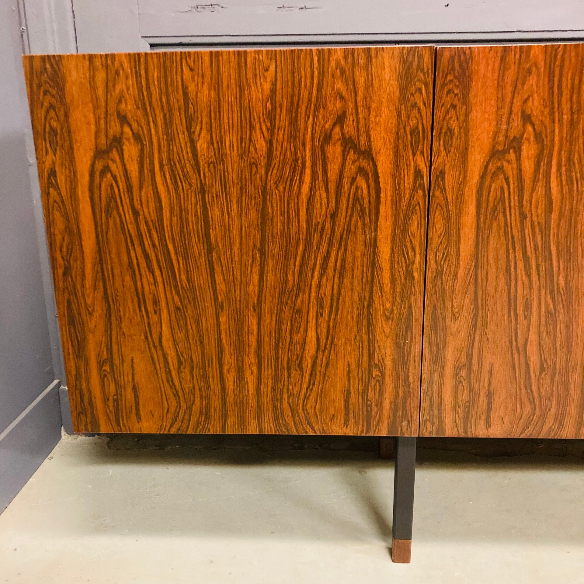 De kast rust op een metalen onderstel. De prachtige houttekening is faux palissander.