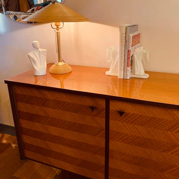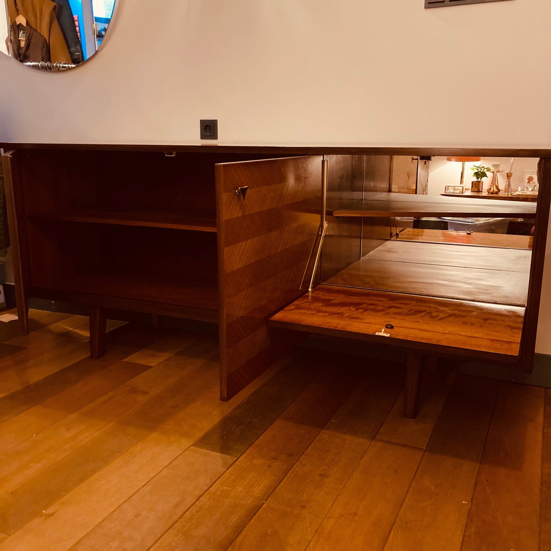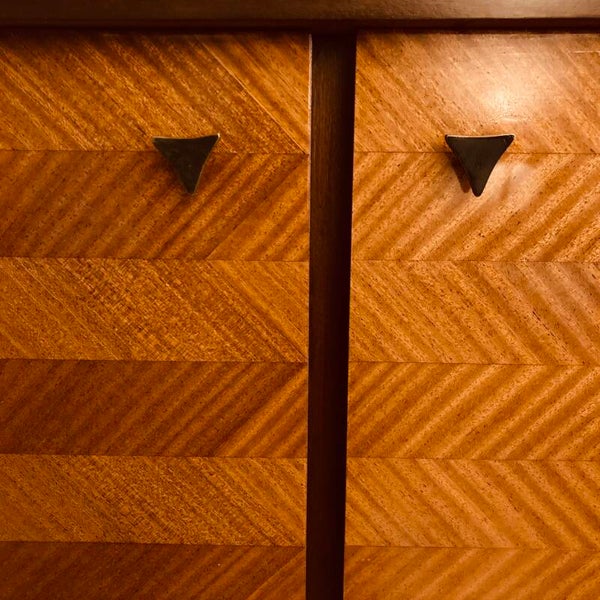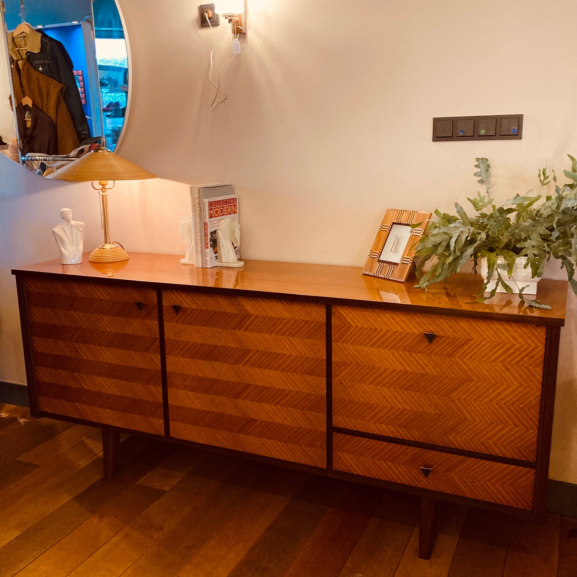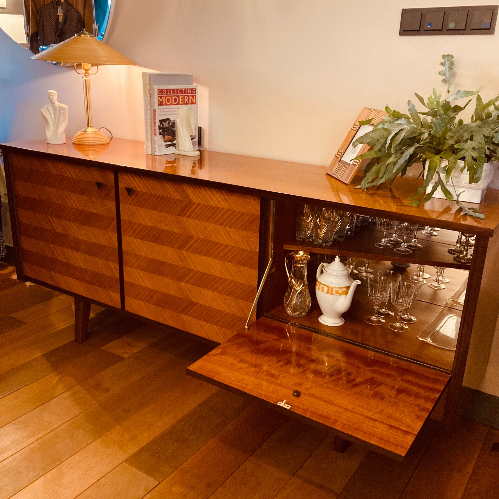 Een stijlvol mid-century dressoir met een klassieke uitstraling. Het intarsia visgraatmotief van teakfineer en het strak gelakte oppervlak geven dit dressoir dat tijdloze, klassieke aangezicht.