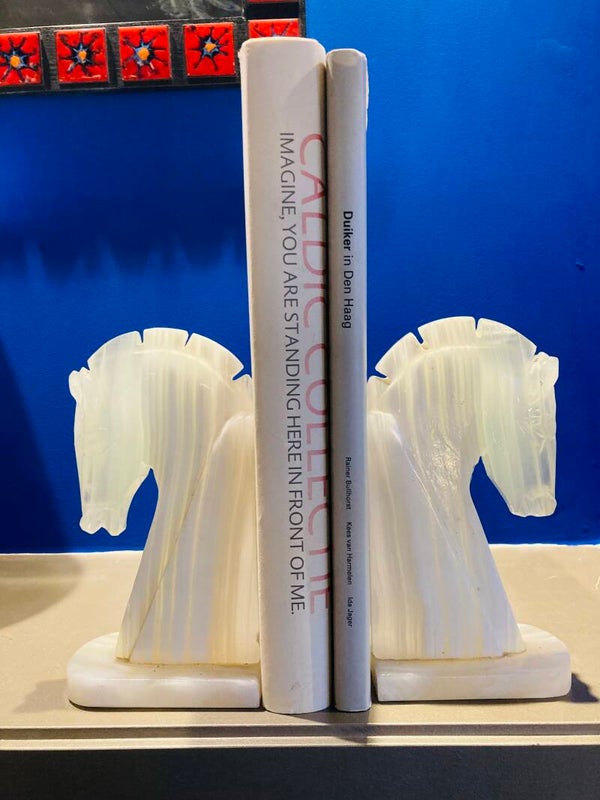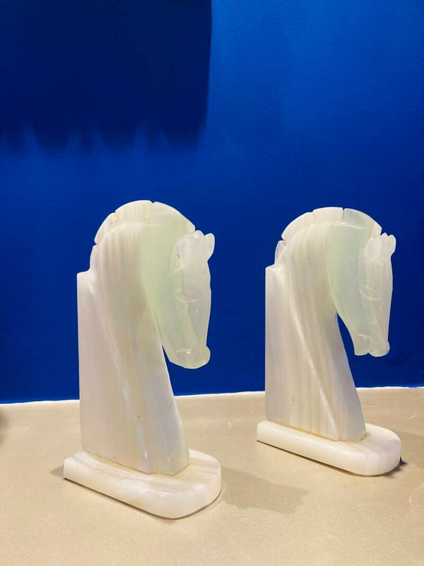 Prachtige set van wit onyx boekensteunen in de vorm van een paardenhoofd.