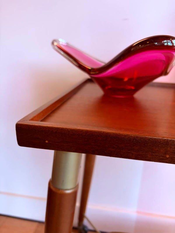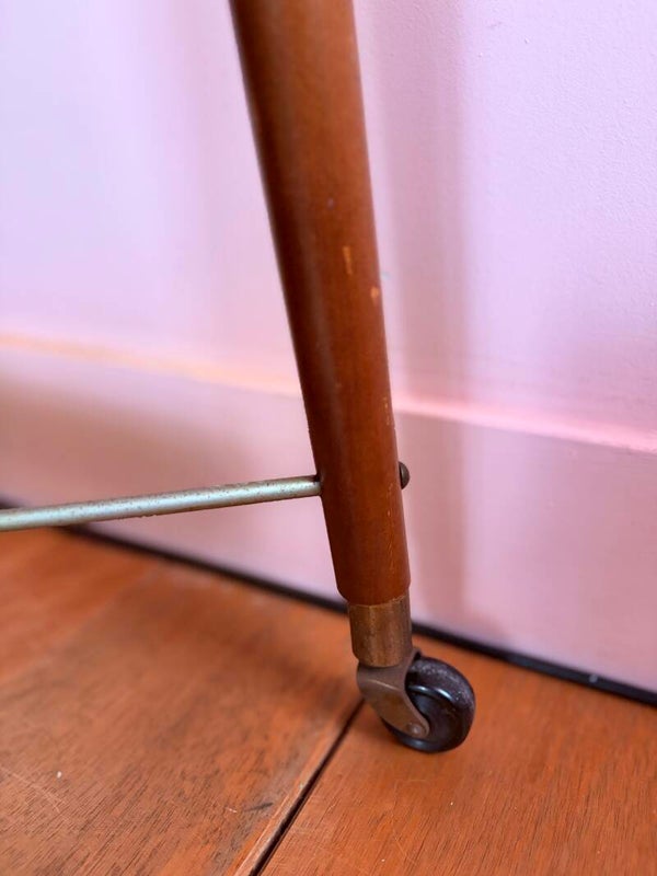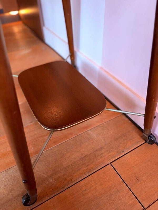 Deze trolley slash barcart is weer zo’n sfeervol fijn mid-century meubel. Het boven- en onderblad en de poten zijn van teakhout, royaal afgewerkt met messing details.