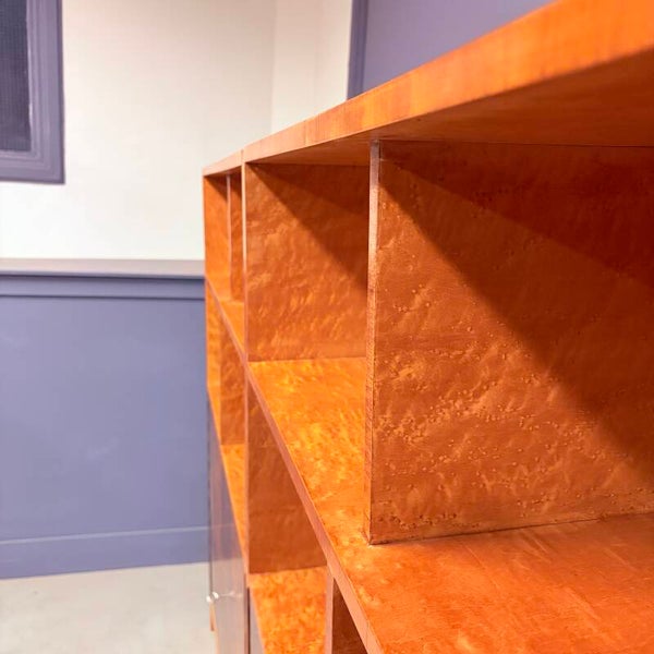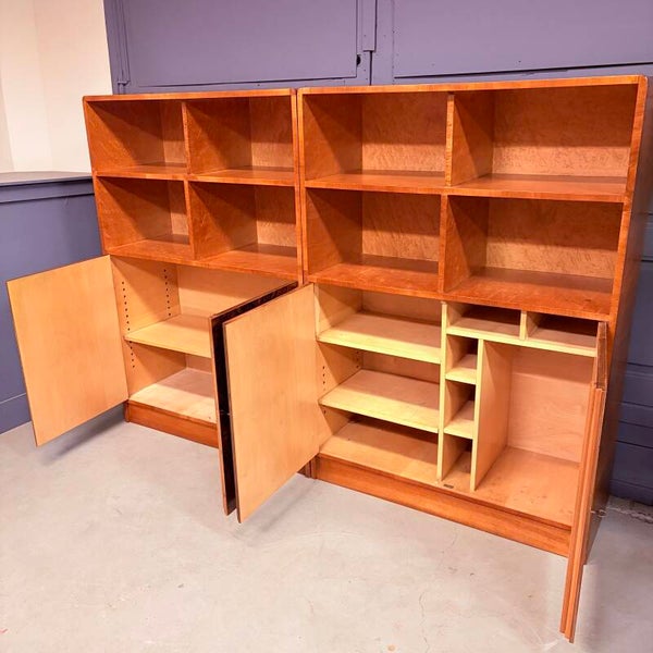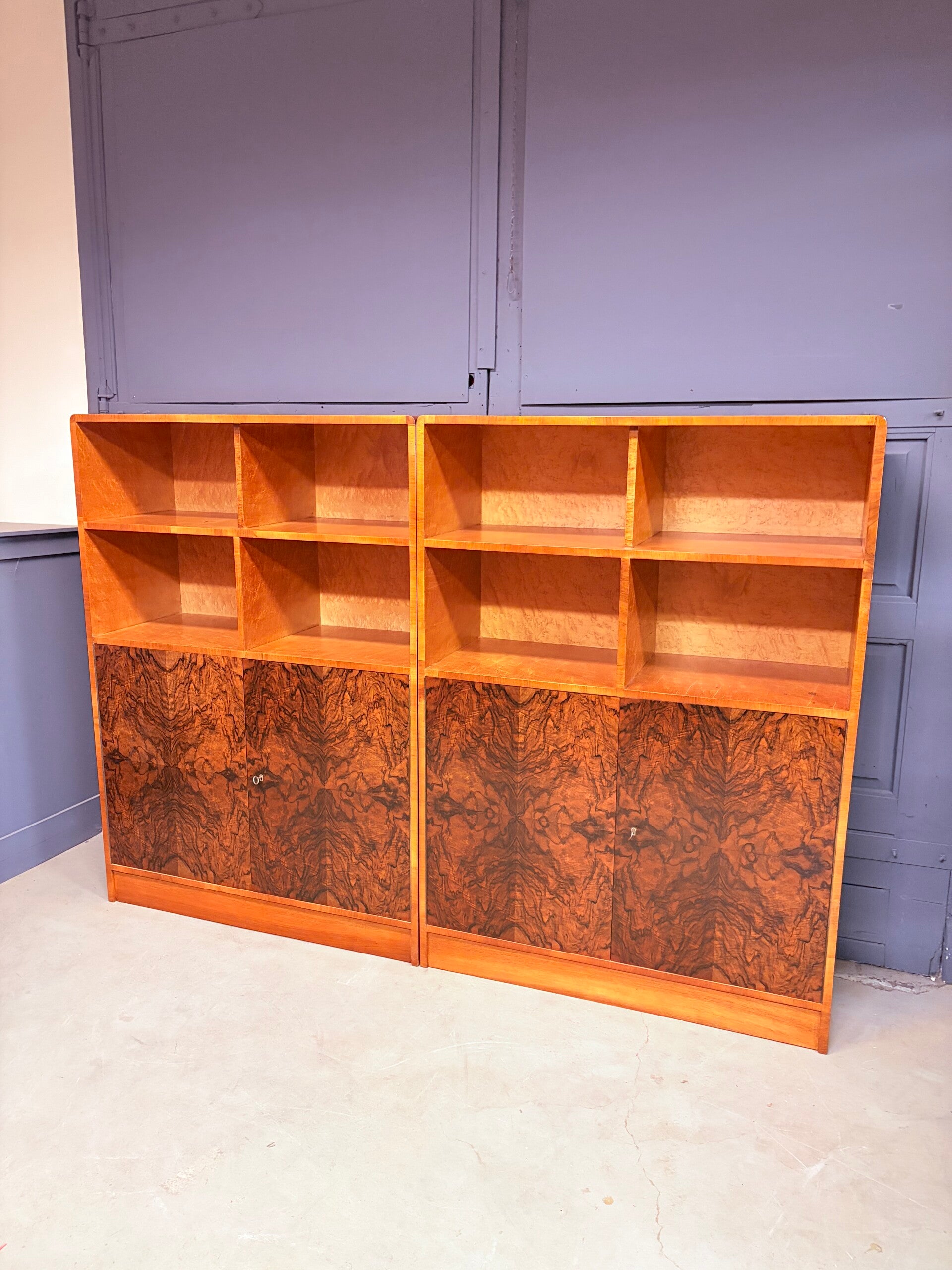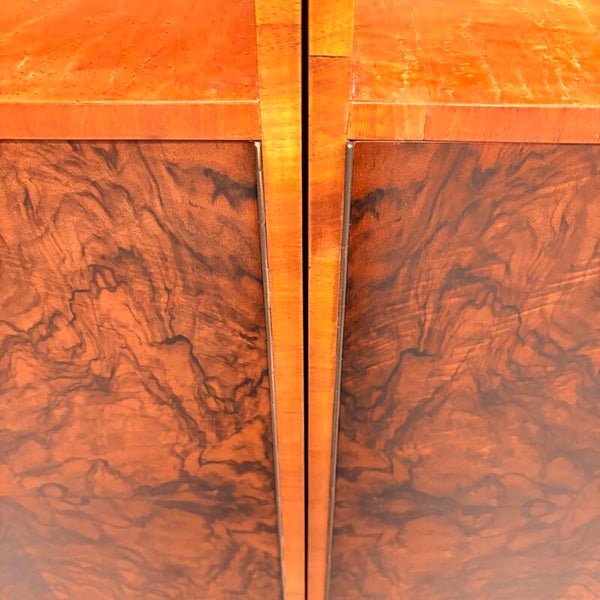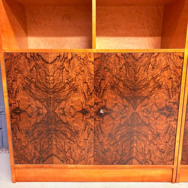 Mooie set van jaren ‘30 rechthoekige art deco boekenkasten met stijlvol afgeronde hoeken. Smaakvol uitgevoerd in wortelnoten fineer met een prachtige houttekening in zowel de deuren als het lichtere esdoorn fineer van de vakken.