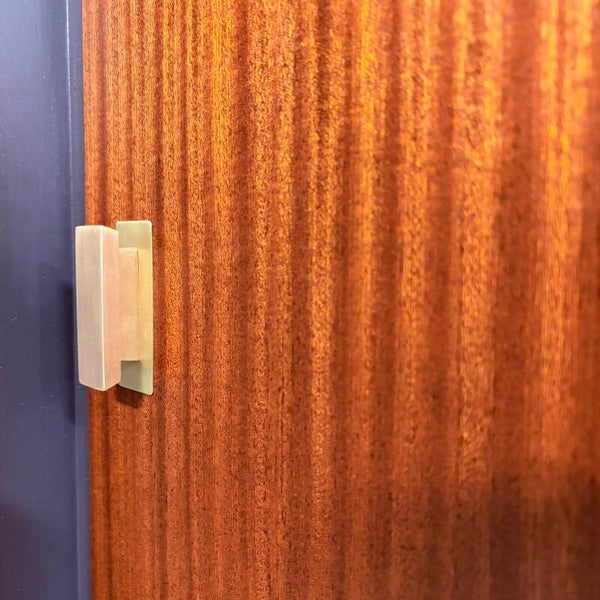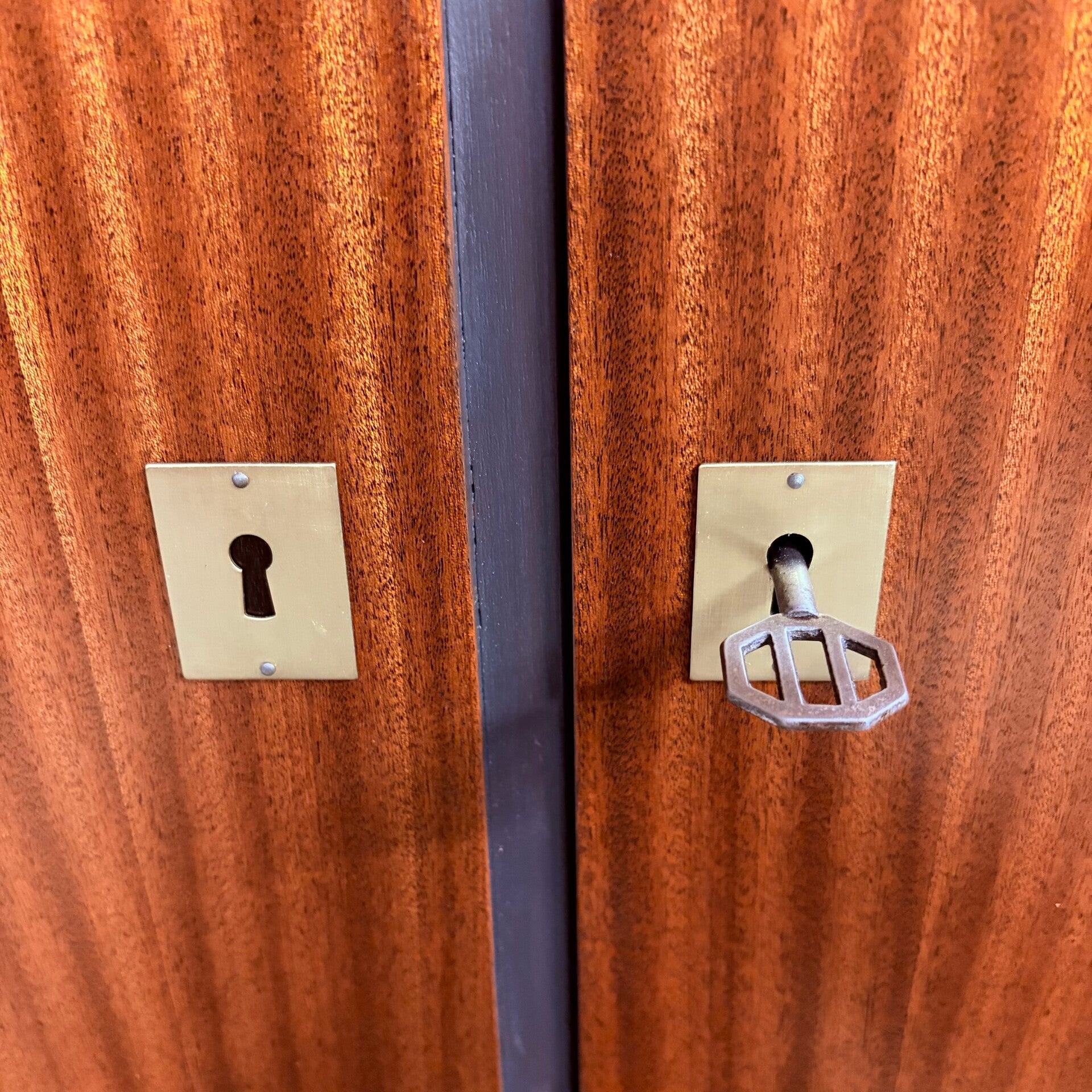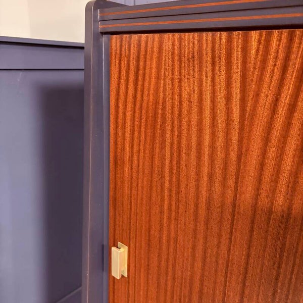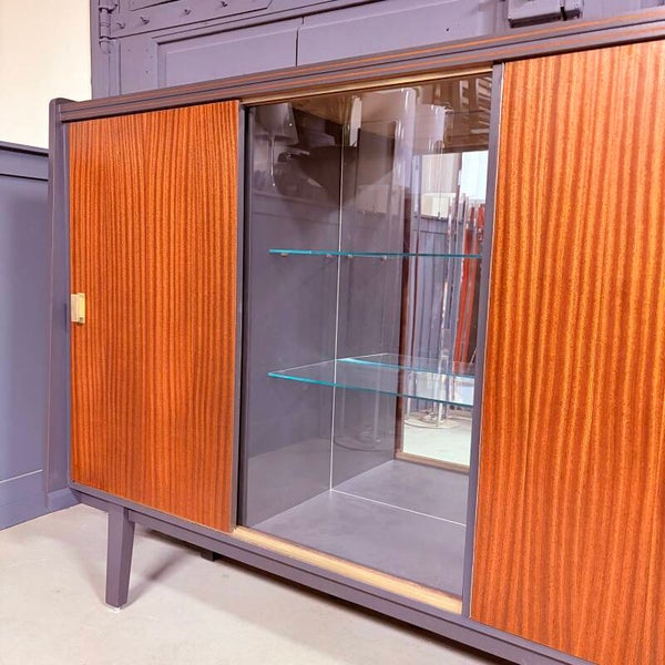 Veel bergruimte, vormgegeven in een mooi meubel met warme uitstraling, messing handgreep en details en met zo’n heerlijk vitrinedeel ertussen. In te richten met een mooi servies, of als bardeel. Of zet er fijne herinneringsobjecten in.