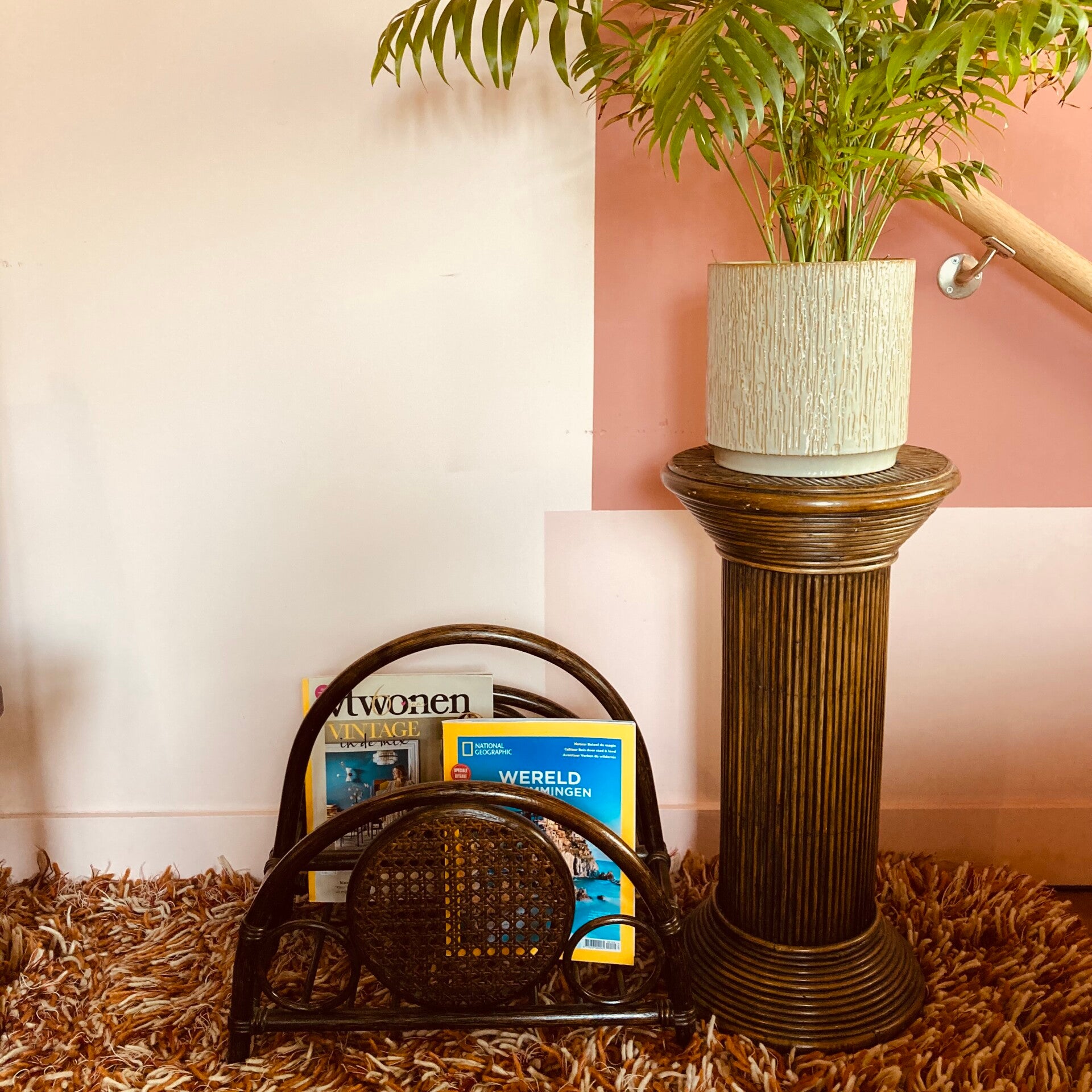 Creëer een rotan bamboe-sfeer en geef wat aandacht aan de kleine interieuropvullers, zoals deze gezellige vintage jaren ‘60/‘70 lectuurbak.