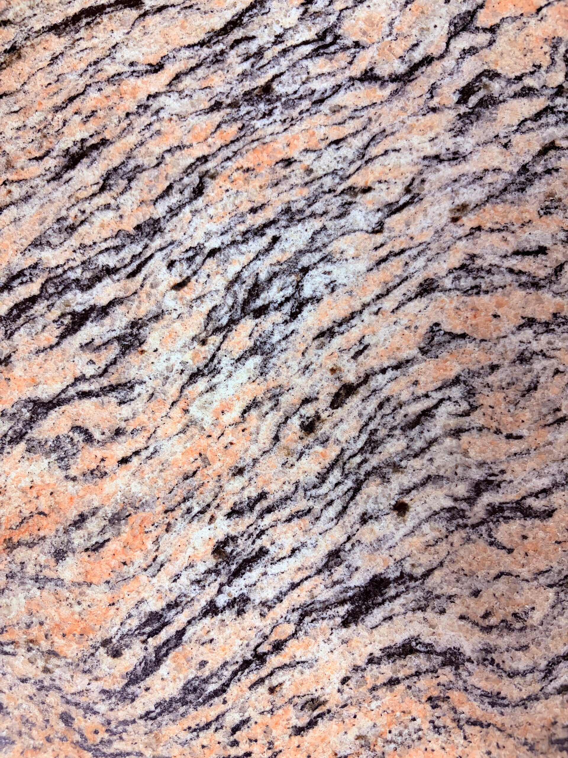 Met deze salontafel van zgn. tijgergraniet met zachtroze, en wit/grijs/zwarte tekening, kun je dan ook alle kanten op.